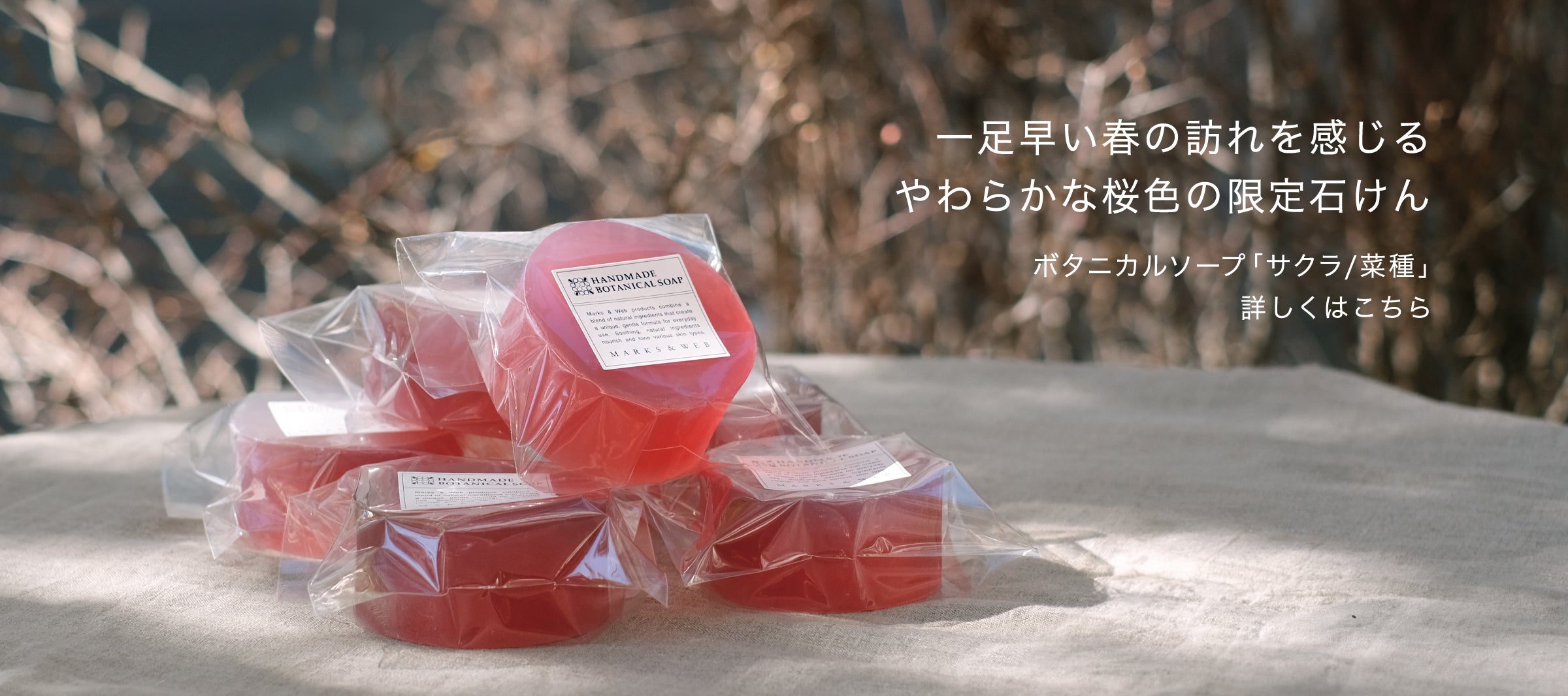 2月5日(木)、桜をイメージした香りの石けんを数量限定で発売します。やわらかな陽ざしの中で咲く桜のような印象深い香りをお楽しみください。整肌成分として、ソメイヨシノの葉から抽出したサク...