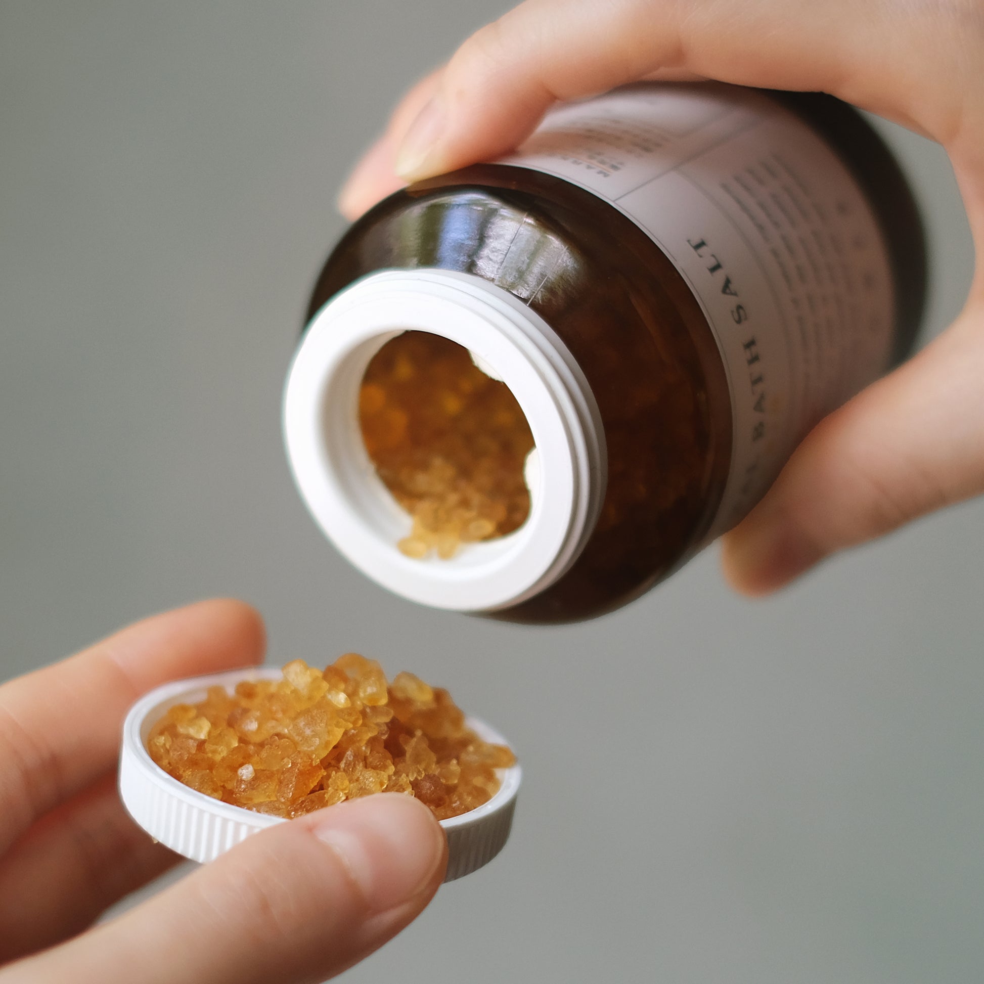 - 「ハーバルバスソルト」は半身浴にもおすすめ。浴槽にぬるめのお湯を、みぞおちの高さほどまで張り、 バスソルトをよく混ぜてから半身浴します。身体があたたまるにつれて、汗が気持ちよく出てきます。