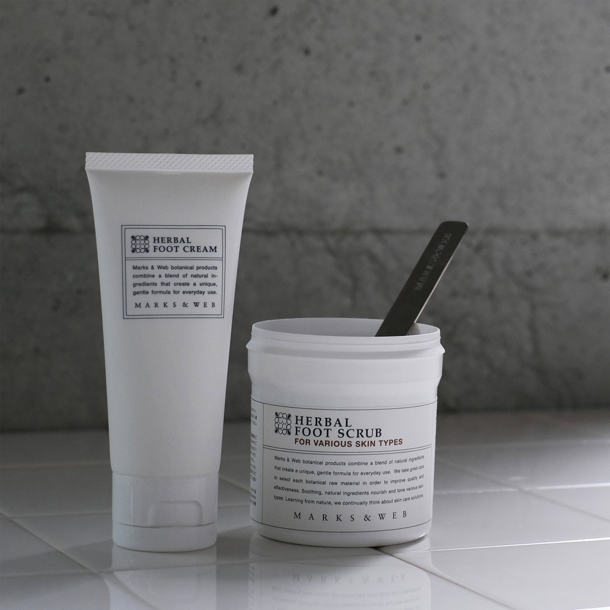 足の裏は、私たちの体重を支えているため硬くなりやすい部位です。また、皮脂腺がないため乾燥しやすく、カサつきやひび割れを起こすこともあります。「ハーバルフットクリーム」は角質を柔らかくする尿素を配合。水分の蒸散を防ぐスクワランとマカデミア種子油の働きで、カサつきが目立つかかとや足の裏、くるぶしなどをしっとりとなめらかに保ちます。清潔感のあるティーツリー精油の引き締まった香り。スクラブで古い角質を落とした後の保湿ケアにおすすめです。