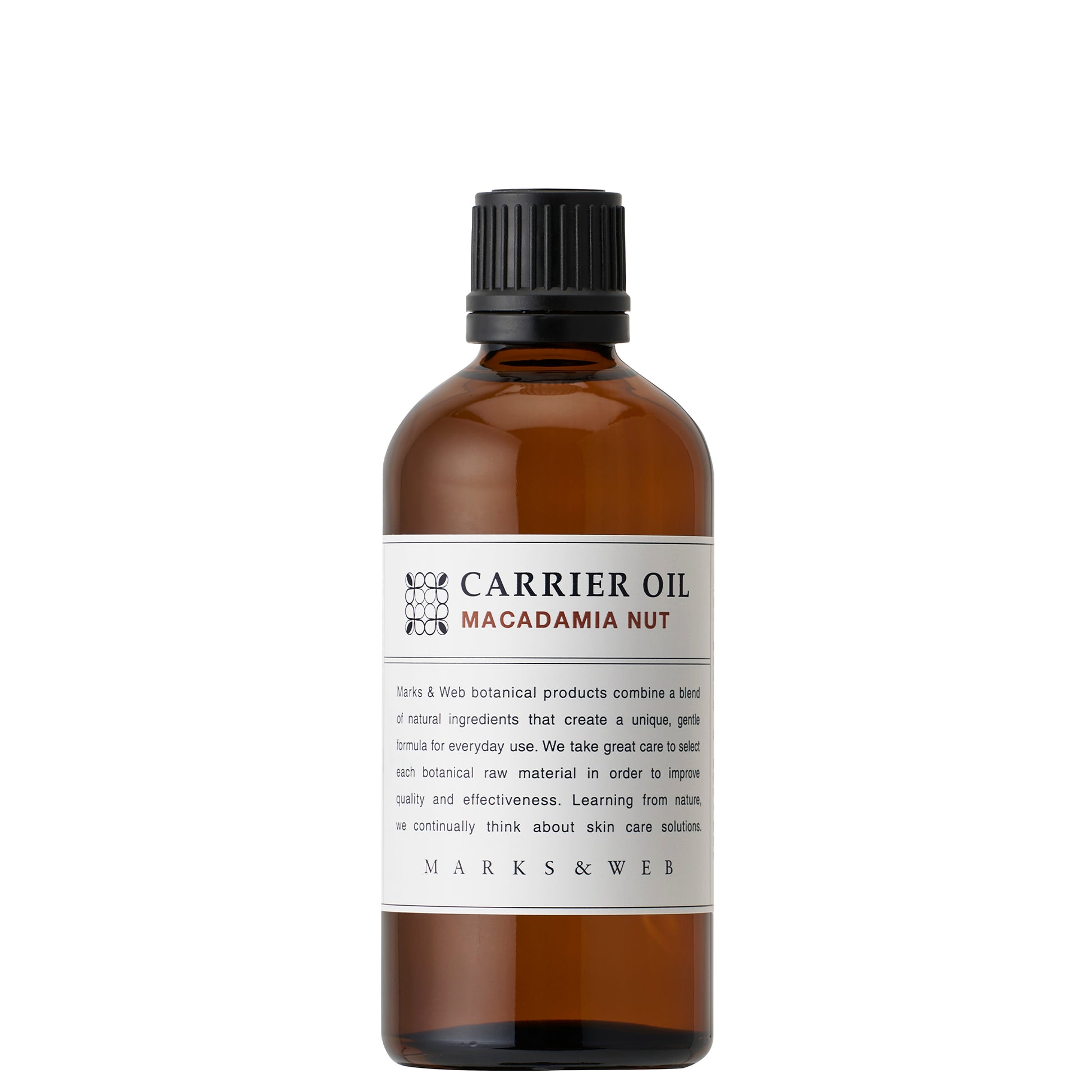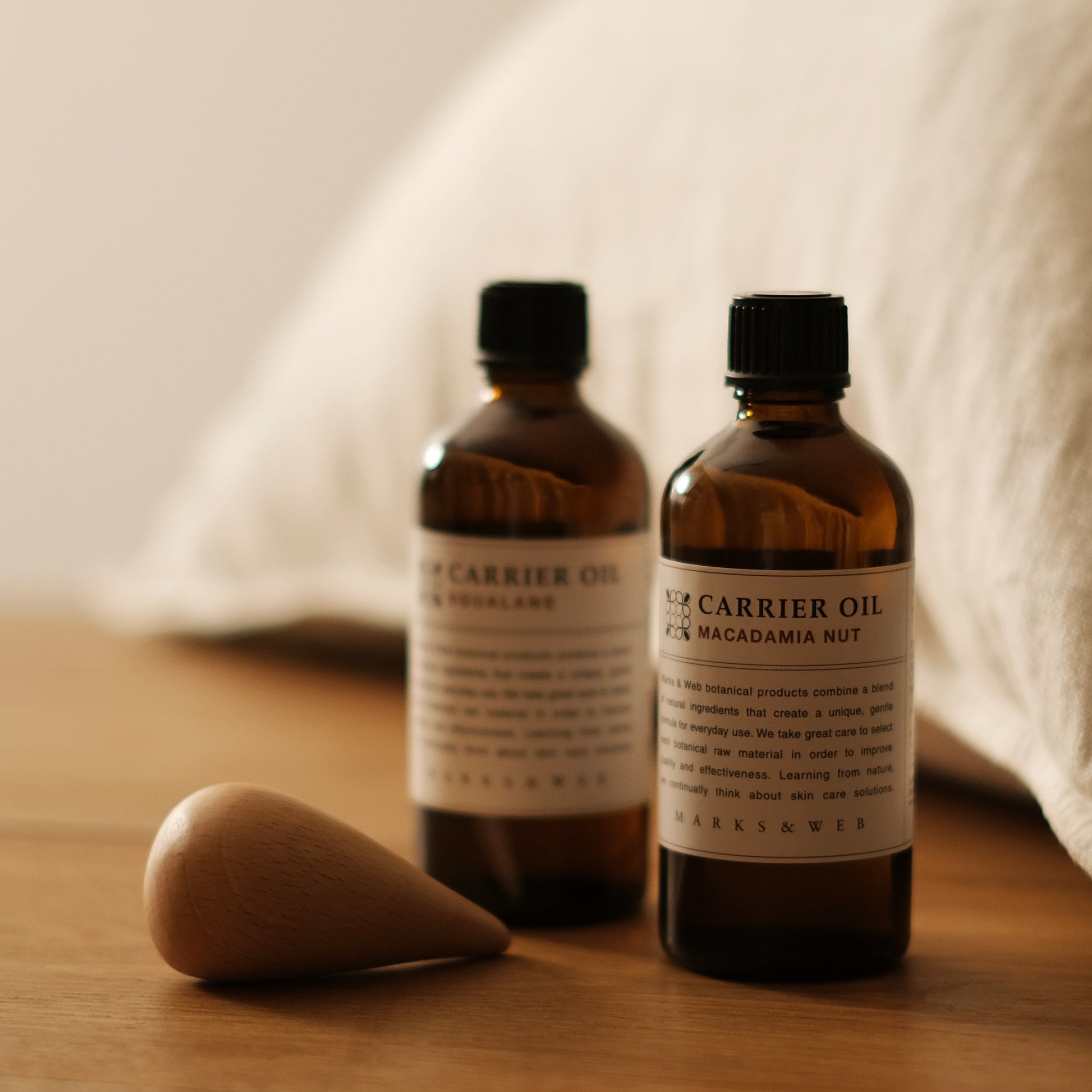 「キャリアオイル」は 精油を希釈するための、植物性・植物由来のオイル。精油の濃縮された香りを、肌におだやかに浸透させます。さらっとした軽い仕上がりや、やや重みがありしっとり感の強いものなど、オイルの組成によって使用感が異なります。「キャリアオイル マカデミアナッツ」は、マカデミアの種子から採取した植物性オイル。皮脂にも含まれ、加齢とともに減少するパルミトレイン酸を約20%含んでいます。ベタつかない、さらっとした感触で皮脂膜の働きを補い、乾燥による肌荒れを防ぎます。素肌のマッサージはもちろん、髪の保湿にもどうぞ。精油を加えず、そのままでも使えます。