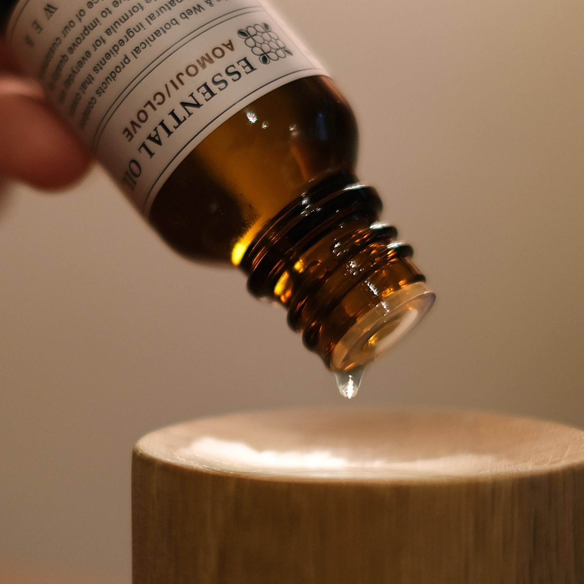 エッセンシャルオイルとも呼ばれる天然精油は、植物から抽出される成分。揮発性の芳香物質を含むもので、植物によって芳香物質を合成する部位は異なるため、精油の抽出部位や抽出方法もそれぞれ異なります。マークスアンドウェブで使用している精油は、全草・花・果皮・樹脂から、水蒸気蒸留法や圧搾法などによって丹念に抽出したもの。そのまま香りを楽しんだり、希釈して肌につけることもできます。「エッセンシャルオイル アオモジ/クローブ」は、スパイシーで温もりを感じる香り。