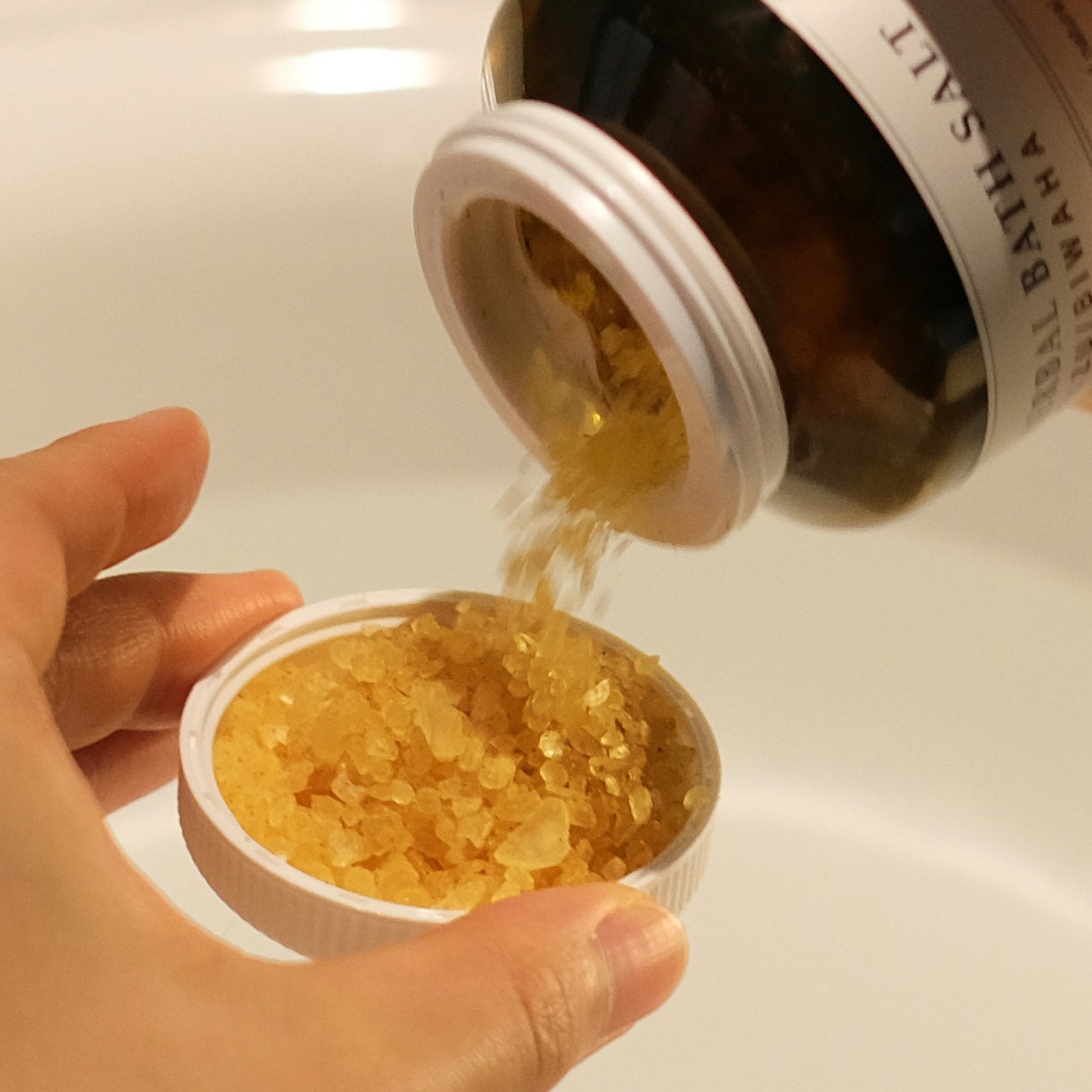 - 「ハーバルバスソルト」は半身浴にもおすすめ。浴槽にぬるめのお湯を、みぞおちの高さほどまで張り、バスソルトをよく混ぜてから半身浴します。身体があたたまるにつれて、汗が気持ちよく出てきます。