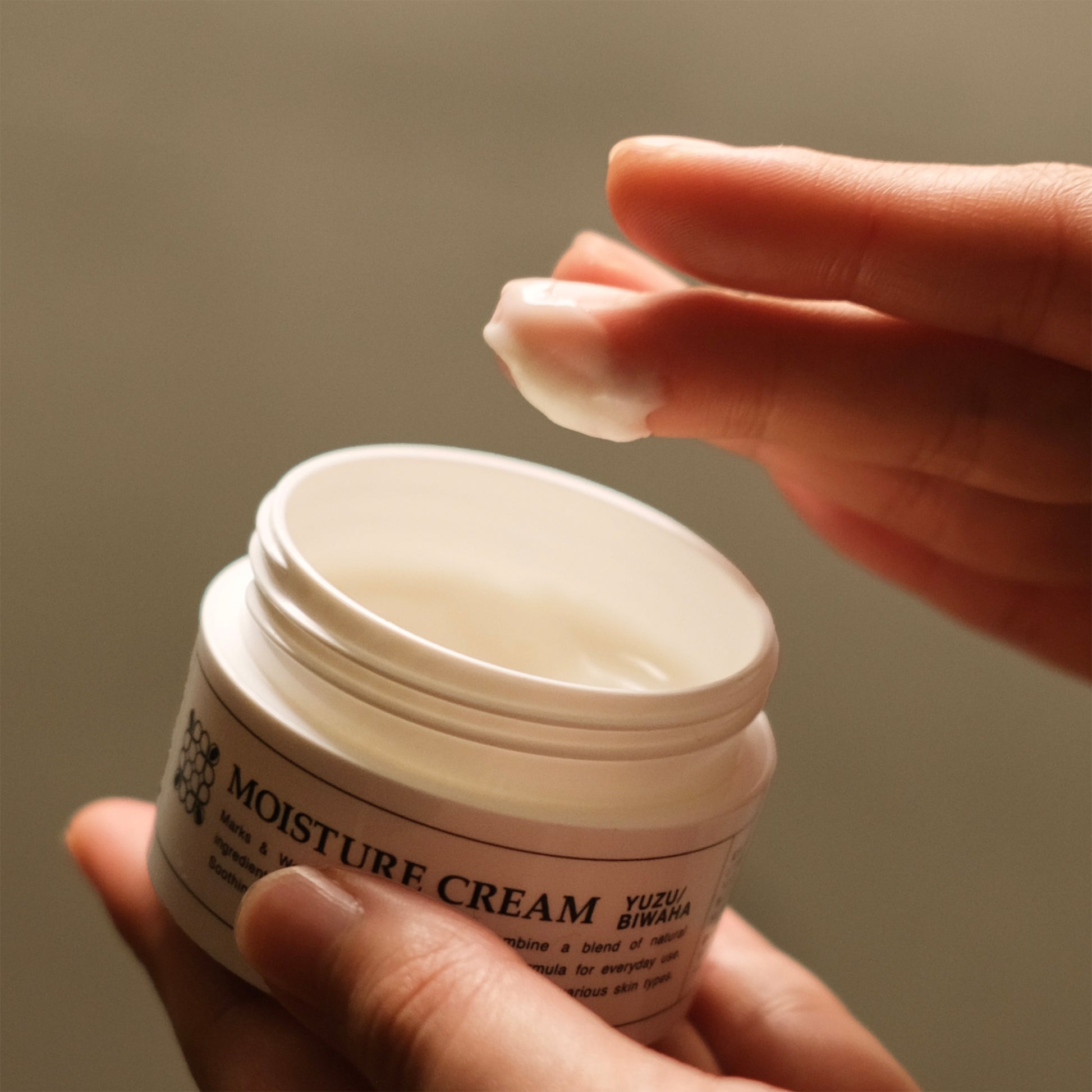 マークスアンドウェブで最も保湿力の高い「モイスチャーフェイスクリーム」に、柚子の香りを限定でご用意しました。肌に柔軟性を与えるアボカド油、アルガンオイル※など4種類の植物油と、保湿成分3種のヒト型セラミドに加えて、植物由来の整肌成分バクチオールとアルニカ花エキスを配合。コクのある濃密なクリームで長時間潤いを保ち、ふっくらとハリのある肌へと導きます。じっくり角質層へ浸透するので、ナイトクリームとしてもおすすめです。乾燥が気になる季節や、年齢を重ねることで不足する肌の弾力やハリが気になる方もどうぞ。柚子精油のさわやかな香り。※全成分表示では、アルガンオイルをアルガニアスピノサ核油と表記しています。