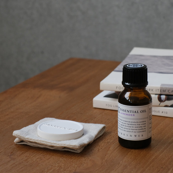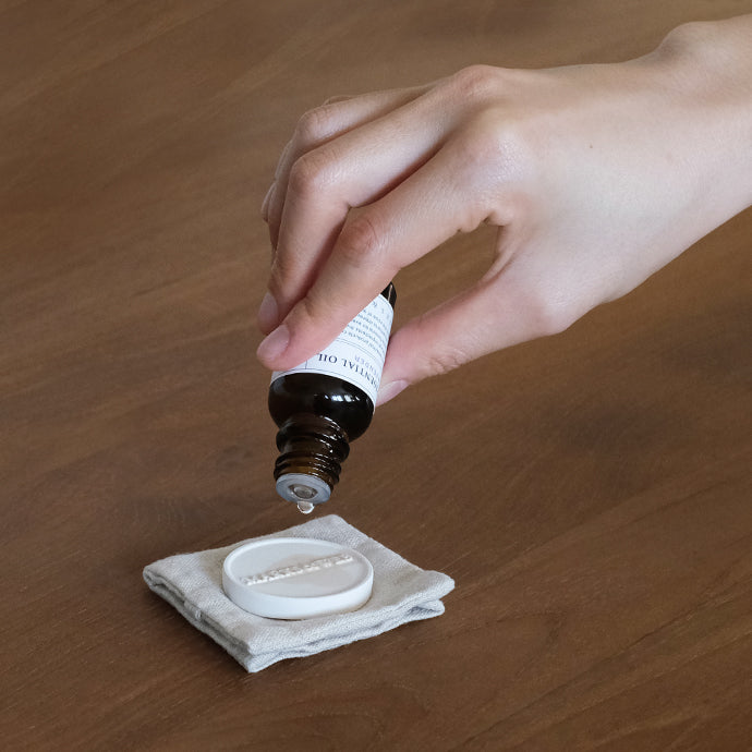 - 推奨量は3〜5滴です。一度に多量の精油を垂らすと裏面に滲み出る可能性がありますので、香りが薄くなったら少しずつ足してご使用ください。