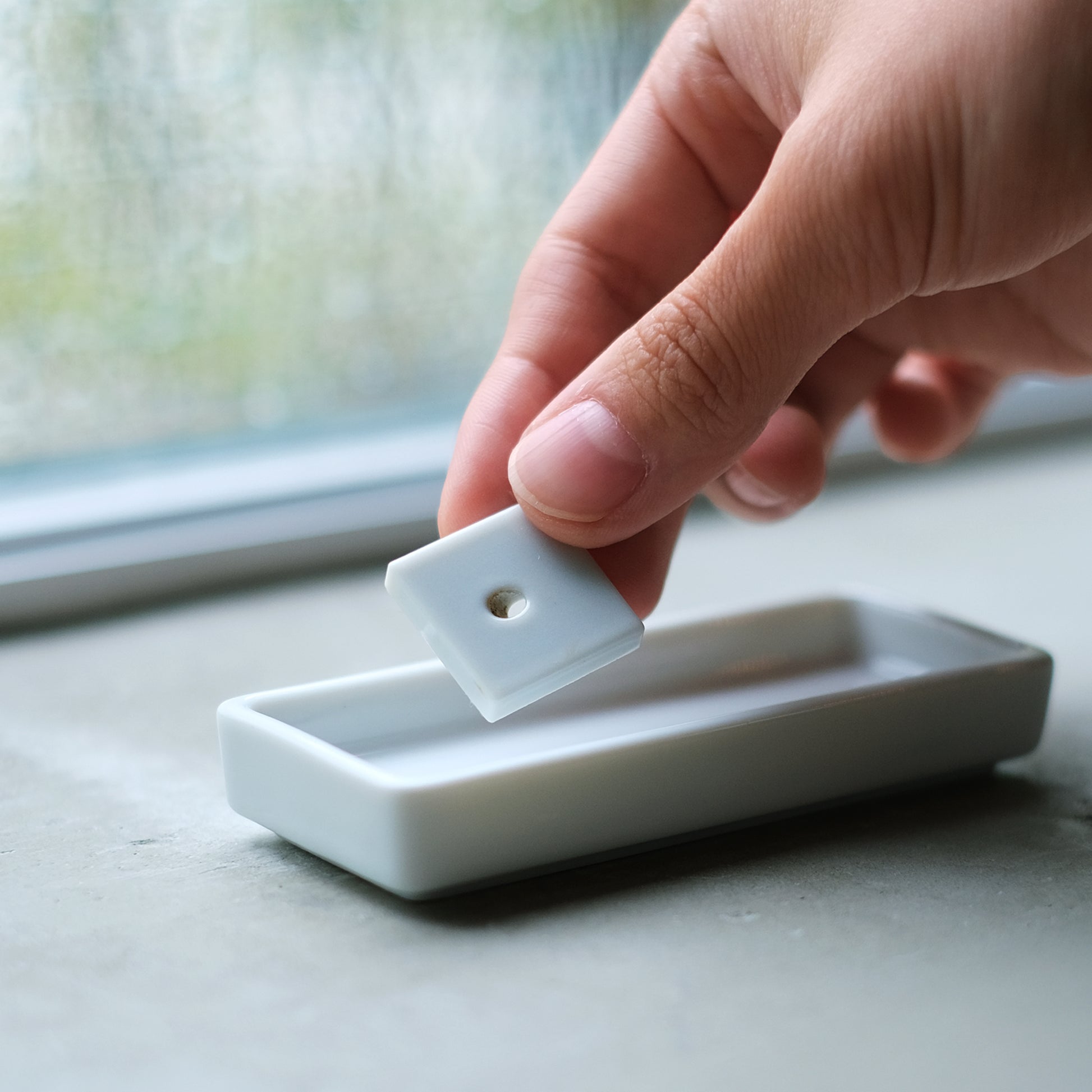 スティックタイプのお香用のホルダーです。長方形のスリムな形状でスペースをとらず、インテリアにも馴染むシンプルな白磁素材。長さ約8cmのマークスアンドウェブの「ハーバル インセンススティック」がバランスよく収まるサイズです。陶磁器の産地である愛知県瀬戸市の職人が一つずつ丁寧に仕上げているため、どこか温かみのある風合いも特長です。