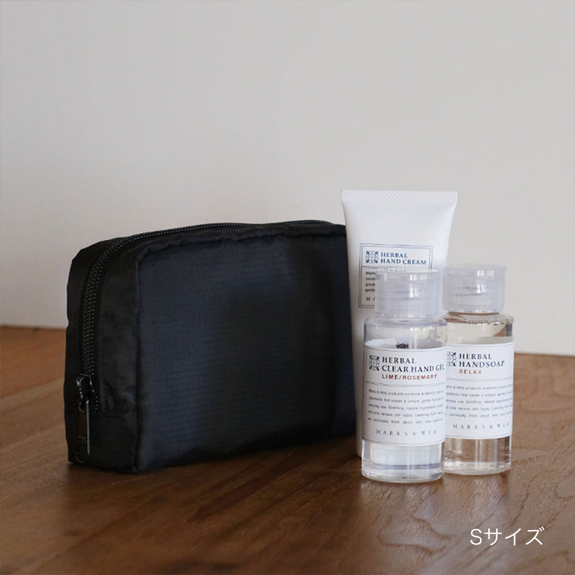 薄くて軽い、リップストップナイロン製のポーチです。格子状に補強糸を織り込んでいるため、丈夫で裂けにくいのが特長です。散らかりやすい小物を整理できる内ポケットや、収納を分けたいときに便利なファスナー付きの背面ポケットも付けました。Sサイズは、60mLのミニボトル3本と「アルミソープケースS」がちょうどよく収まるサイズ。持ち歩きしやすく、コスメポーチとしてはもちろん、旅行や出張、アウトドアなどのレジャーシーンでも活躍します。Lサイズは、250mLボトルなら3本まで入るたっぷりの容量で、長期の旅行にも活躍。小さなお子様とのお出かけに、おむつや着替え、タオルなどを入れてご使用いただくのもおすすめです。サイズが大きい分、開け閉めしやすくなるよう口元にはダブルファスナーを使用。また、内ポケットをメッシュ素材にすることで中身を確認しやすくしています。