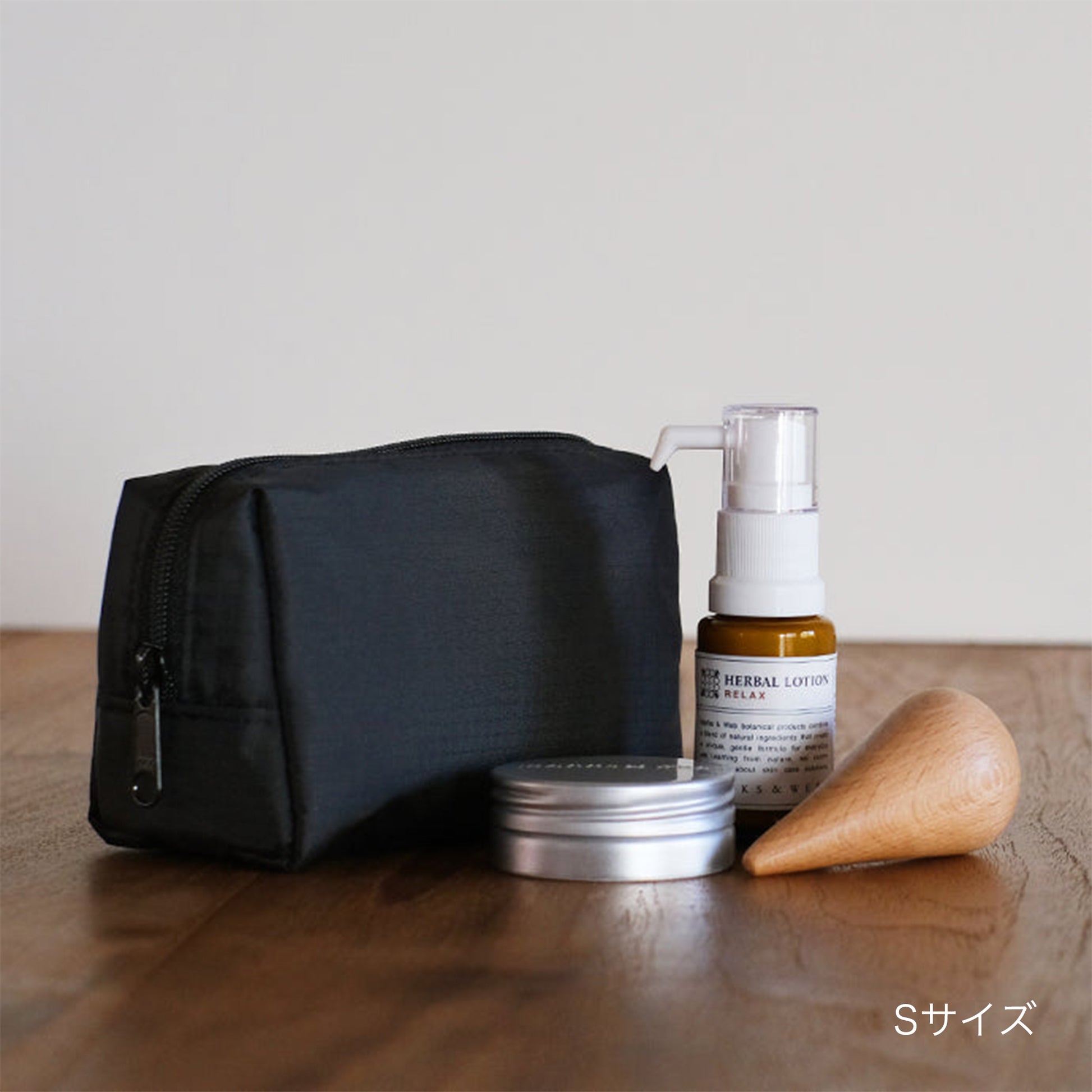 マチが広く、しっかりと安定性のあるポーチです。軽くて丈夫なリップストップナイロンでつくりました。コロンとした丸みのあるデザインで、かさばりやすい化粧品も収まりやすく、見た目以上に収納できます。コンパクトなSサイズは、リップクリームなど散らかりやすい小物を入れるコスメポーチとしてもおすすめ。「ハーバルハンドクリーム」や、「ウッドヘアコーム S」も収まります。Lサイズは日常使いはもちろん旅行用にも。クリームなど円筒形の容器も収まりがよく、お気に入りのフェイスケアアイテムを持ち運びできます。
