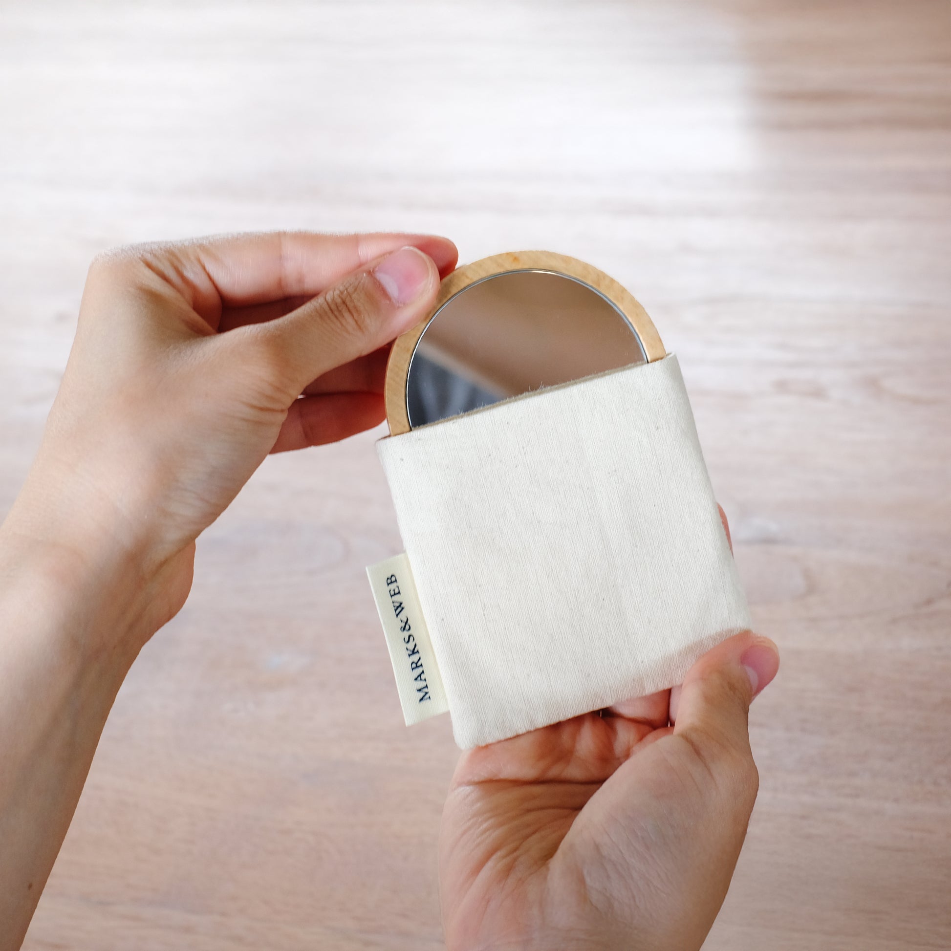 なめらかな手触りのブナ材でつくった、コンパクトなサイズの鏡です。「ラウンド」は、手のひらに収まりやすいシンプルな丸型の等倍鏡。移動中や外出先にもさっと使えて便利です。「スクエア」は、等倍鏡と細部を見やすい3倍の拡大鏡が付いた2面タイプ。目元など、細かな部分のチェックにもおすすめです。マグネット内蔵で開閉をスムーズにしました。どちらも持ち歩きにも便利な綿製のケース付きです。