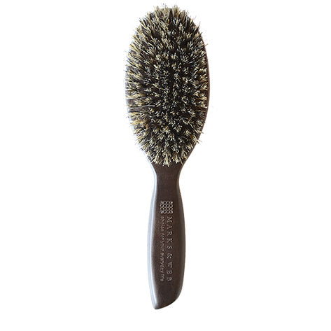 なめらかな手触りのブナ材に、天然素材の豚毛を植え込みました。傷みやすいキューティクルにやさしく、髪をつややかに整えます。天然ゴムを使用せず、木材に直接豚毛を植え込むことで、よりシンプルで劣化しにくい形状に仕上げました。ブナの部分は、性別を問わず使いやすいダークグレーに着色。木材の色に合わせて、豚毛も黒と白の毛をブレンドしました。ブラシ面がフラットなのでやさしい肌当たりです。