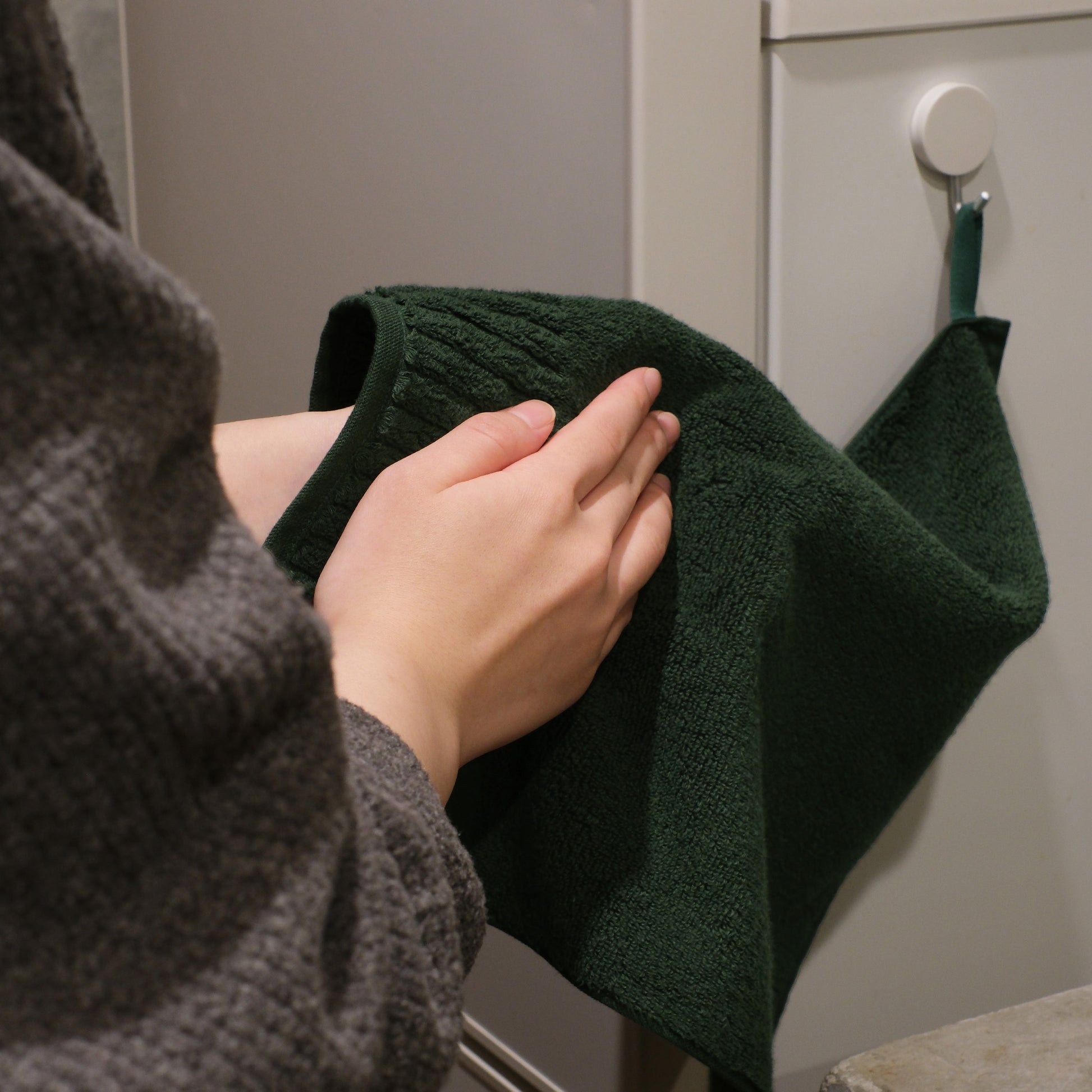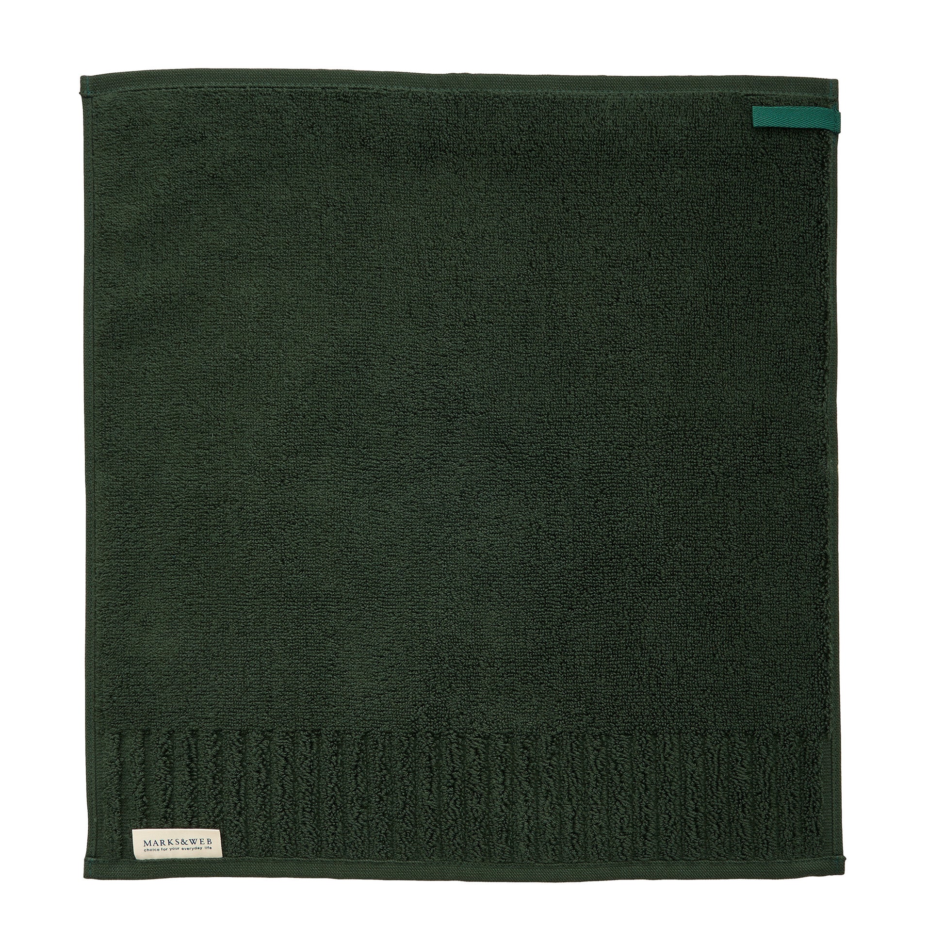 冬らしい深みのあるグリーン色に染め上げた、限定色のオーガニックコットンタオルです。お客様のご要望にお応えしてフック用ループをつけました。洗面所やキッチンなど、スペースをとらずに掛けることができます。毎日使うことを考えて、経(たて)糸と緯(よこ)糸、パイルのすべてにオーガニックコットンを使い、タオルの産地として知られる今治市の工場で丁寧に織り上げました。高密度でふんわりとしたパイルが、デリケートな肌の水分や汗をすばやく吸収します。年末年始のご挨拶など贈り物にもおすすめです。