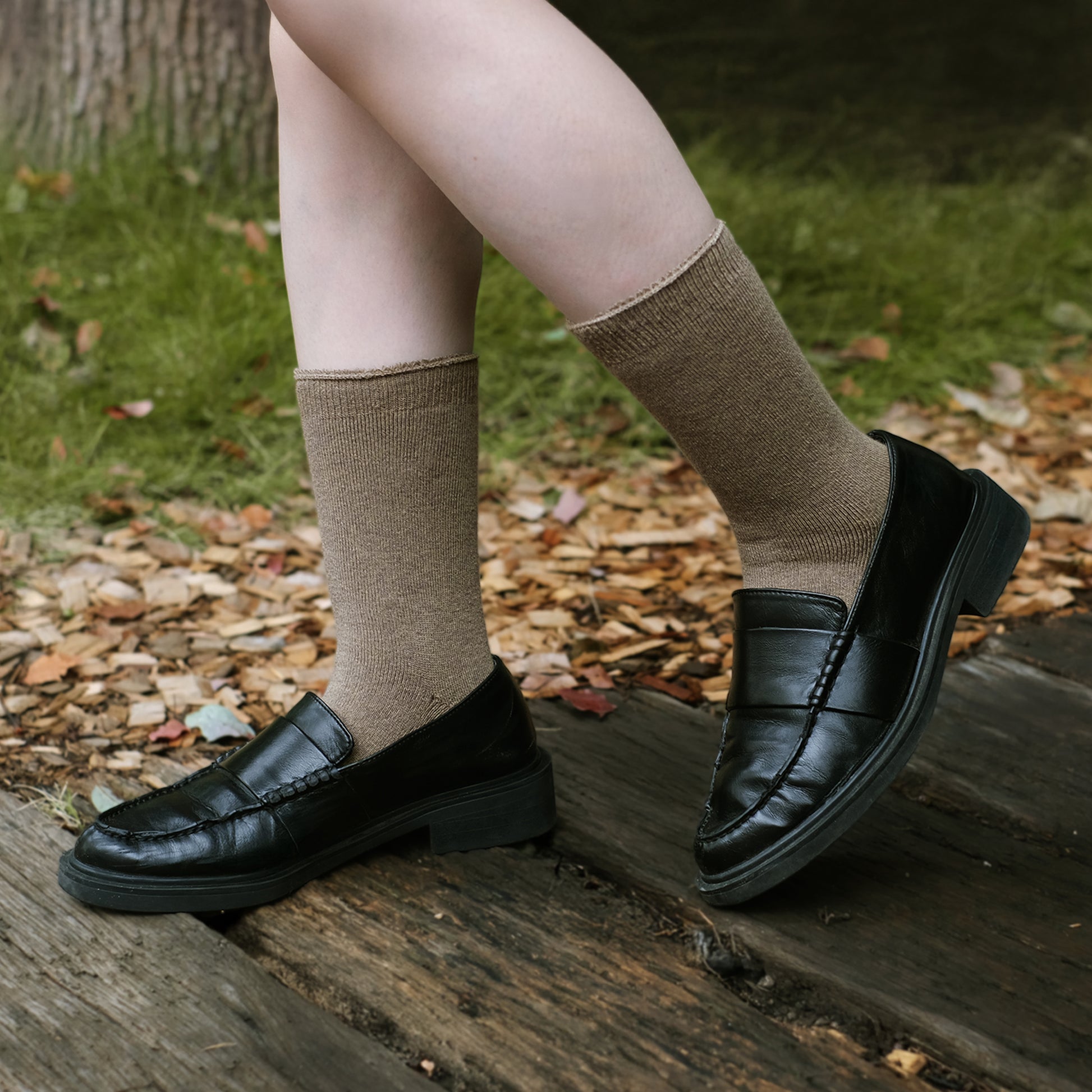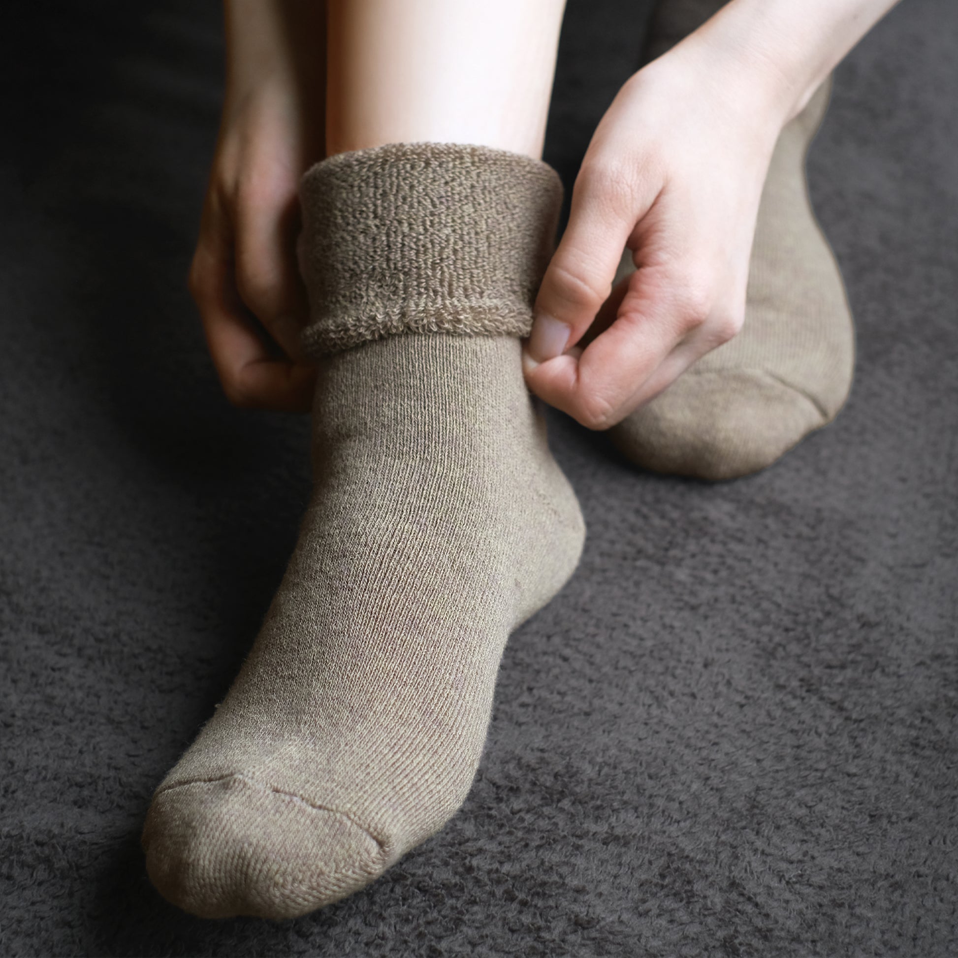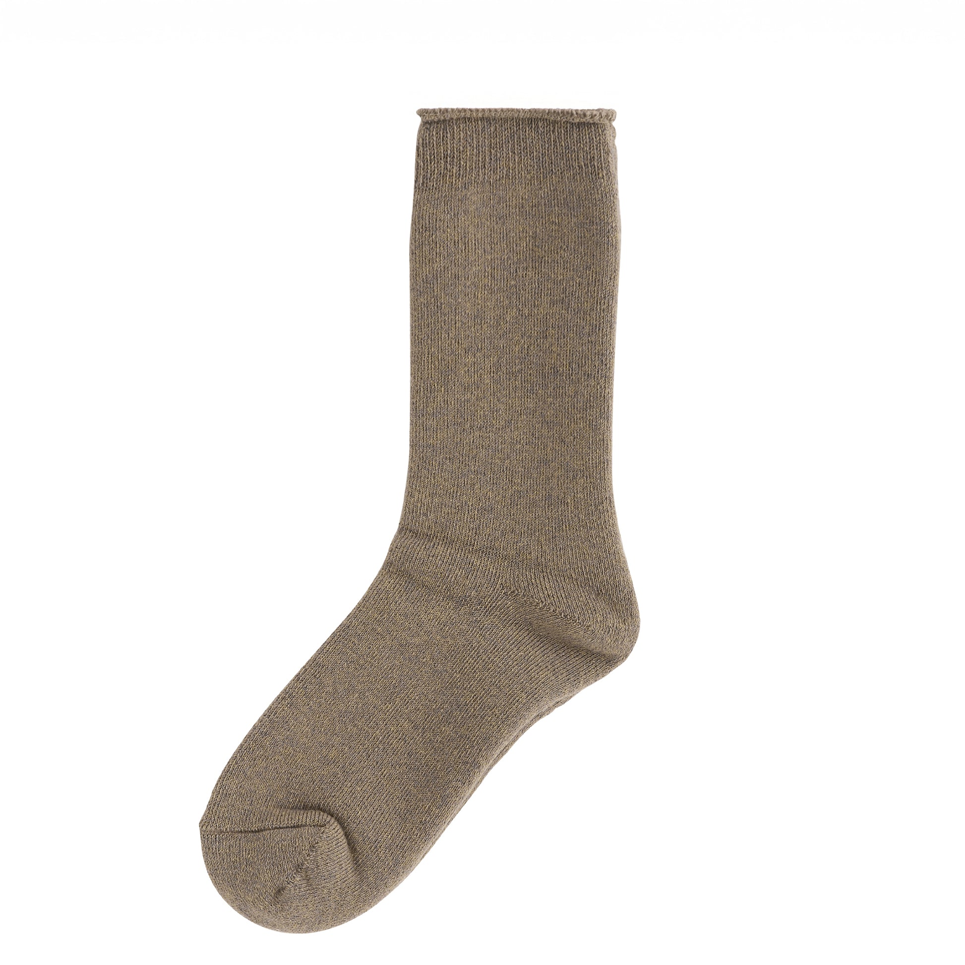 オーガニックコットンとメリノウールの混紡糸で編み上げました。ウールの保温性とコットンの丈夫さを兼ね備えた靴下です。内側はやわらかなパイル編みで、クッション性にすぐれ、心地よい履き心地で足元を冷えから守ります。裏返してリバーシブルとしても使えます。冬らしい温かみのあるベージュとブラウンの2色展開。