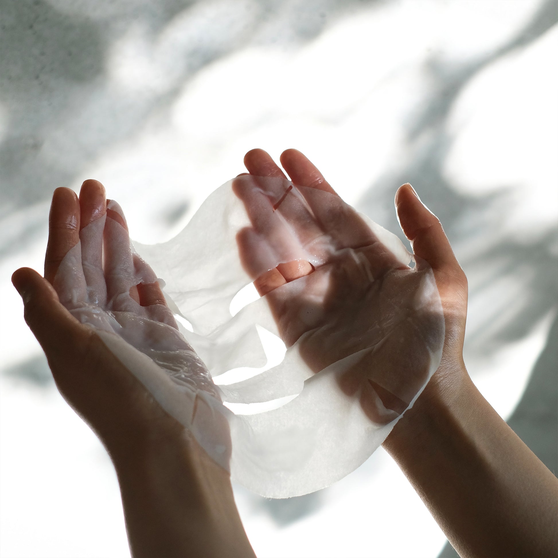 化粧水で肌を整えた後、清潔な手でマスクを取り出し広げます。はじめに目、次に口の位置を合わせ、マスク全体を軽く押さえて顔に密着させます。10分程おいた後にマスクを取り、顔に残った美容液を手のひらでよくなじませます。