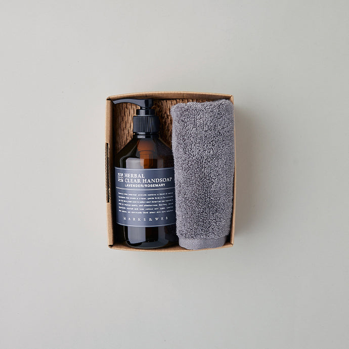 手肌をさっぱりと清潔に洗い上げるハンドソープと、ハンカチタオルを合わせたシンプルなセットです。「ハーバルクリアハンドソープ」はラベンダー精油とローズマリー精油のすっきりとした香り。男女問わず、様々な用途のギフトにおすすめです。
