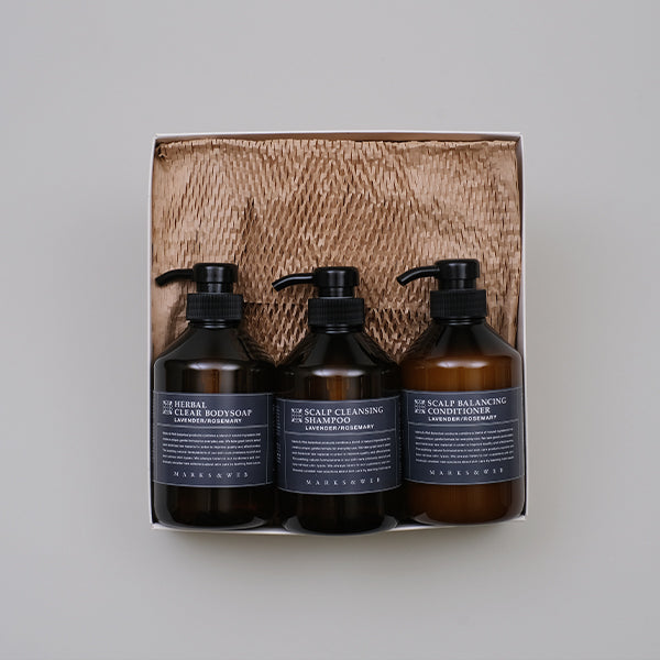 髪と地肌をすっきりと洗い上げるシャンプーとコンディショナー、さっぱりとした洗い上がりのボディソープをセットにしました。ラベンダーとローズマリーの甘すぎないすっきりとした天然精油の香り。家族で使えるアイテムは季節のご挨拶や贈り物にも。