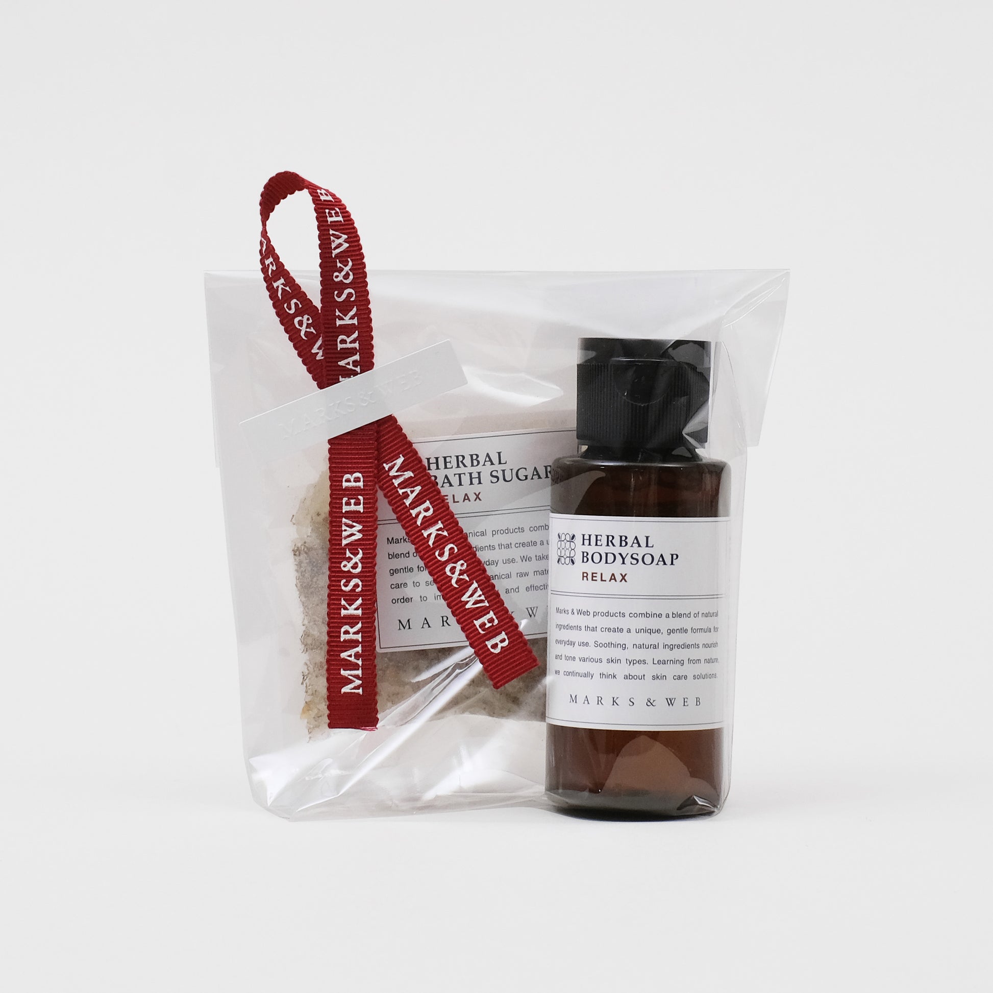 ハーブの質感や香りを楽しめる入浴料「ハーバルバスシュガー」1回分とミニサイズのボディソープを合わせたプチギフト。お気に入りの香りを旅先へ携帯できるセットは、出張の多い方やお出かけが好きな方へもおすすめです。