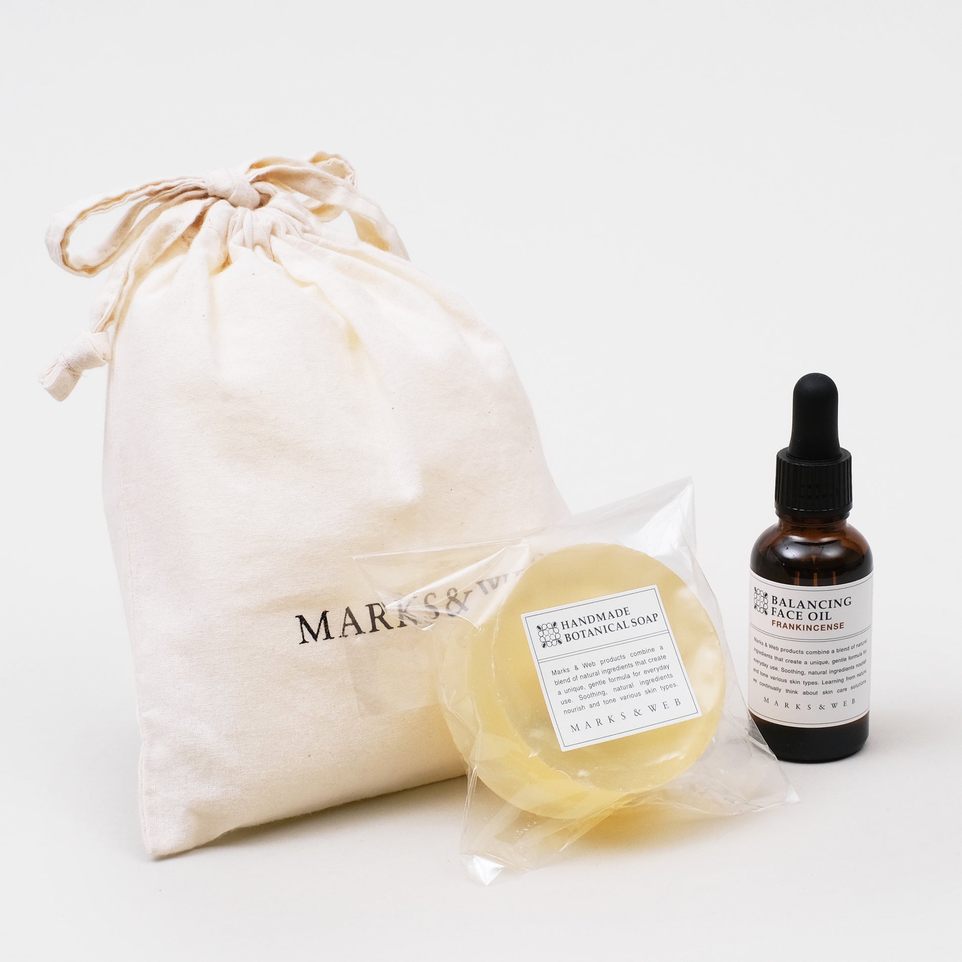 季節限定「フランキンセンス」の石けんと美容オイルをコットンポーチに詰め合わせました。洗顔後、美容オイルを数滴手に取ってやさしくなじませると、化粧水の浸透を促しやわらかな肌に導きます。いつものケアにプラスして使いやすいアイテムです。