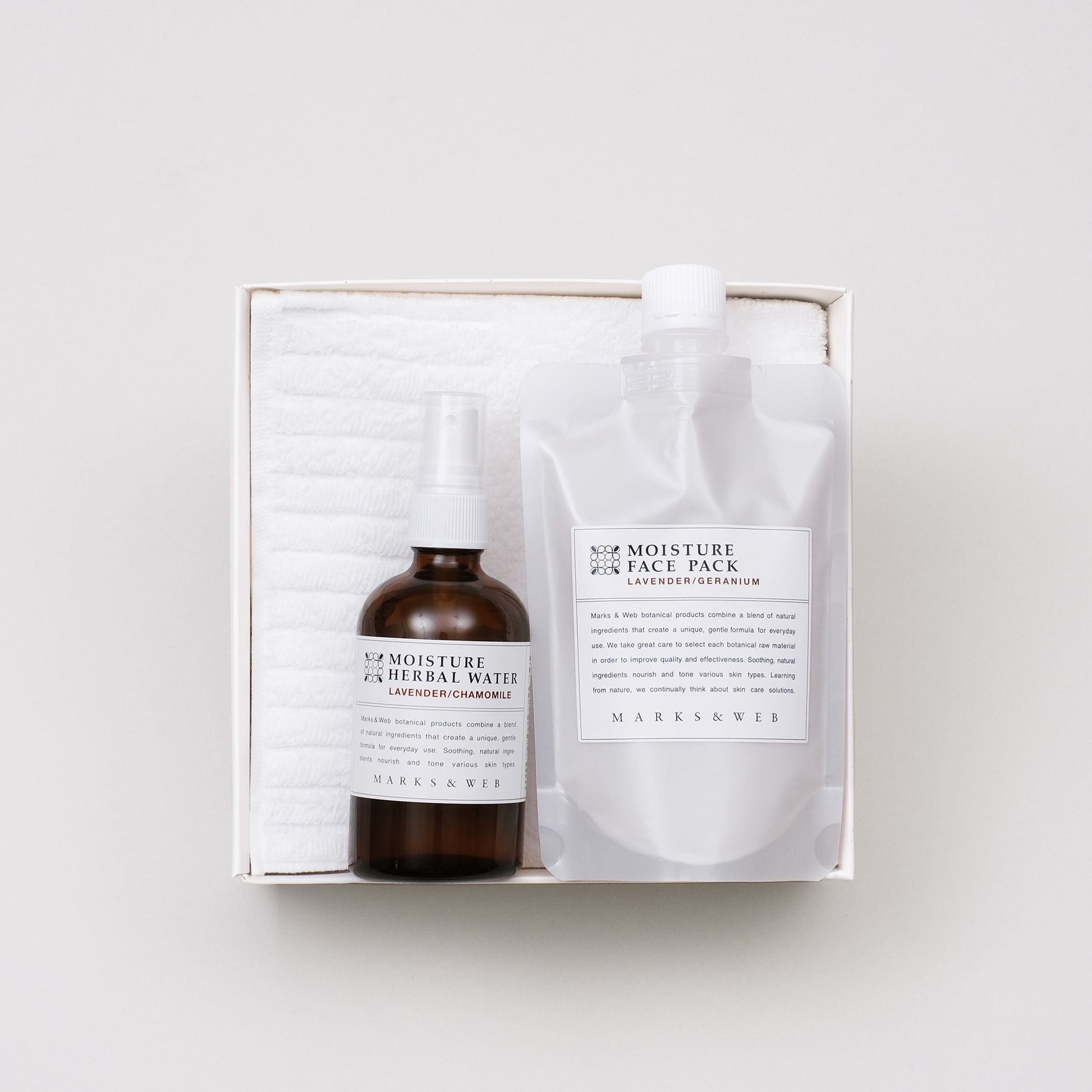 乾燥が気になる季節に贈りたいフェイスケアセット。潤いとハリを与える成分を配合した高保湿化粧水、肌をしっとりとやわらかく整える洗い流すパック「モイスチャーフェイスパック」を組み合わせ、肌触りのよいタオルを添えました。肌に心地よいアイテムをプレゼントしませんか。