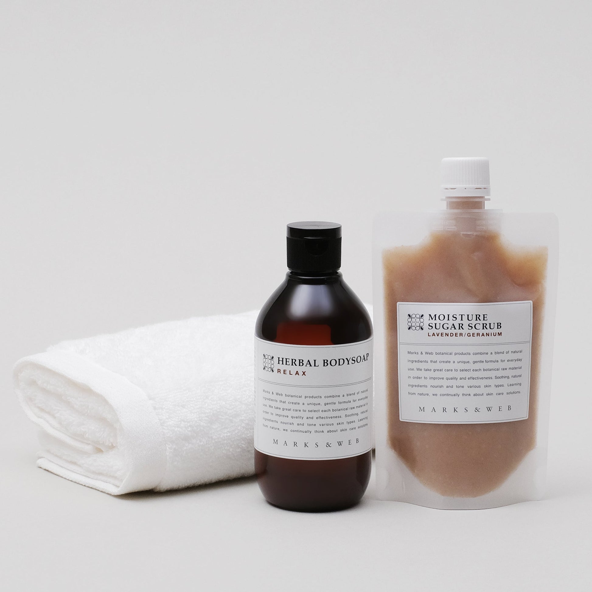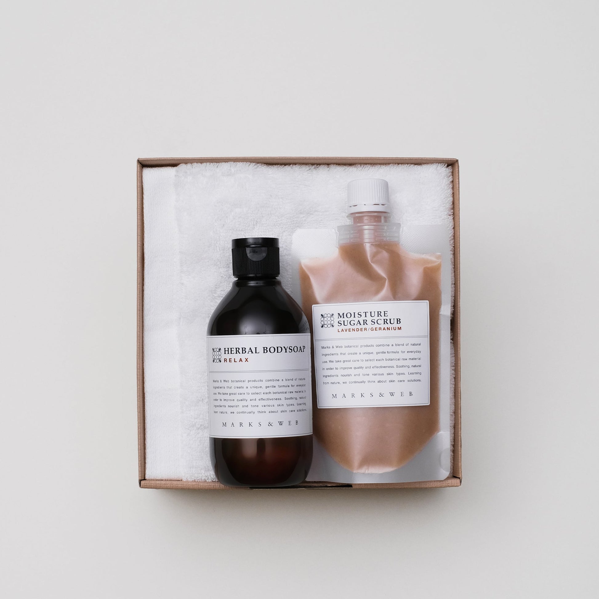 定番のボディソープと身体用スクラブに、ふわっと軽い「エアータオル」を添えました。オイルベースの2種類の砂糖を配合したスクラブは、潤いのあるやわらかな肌に整えます。いつものバスタイムが楽しくなるような、もらって嬉しいギフトです。