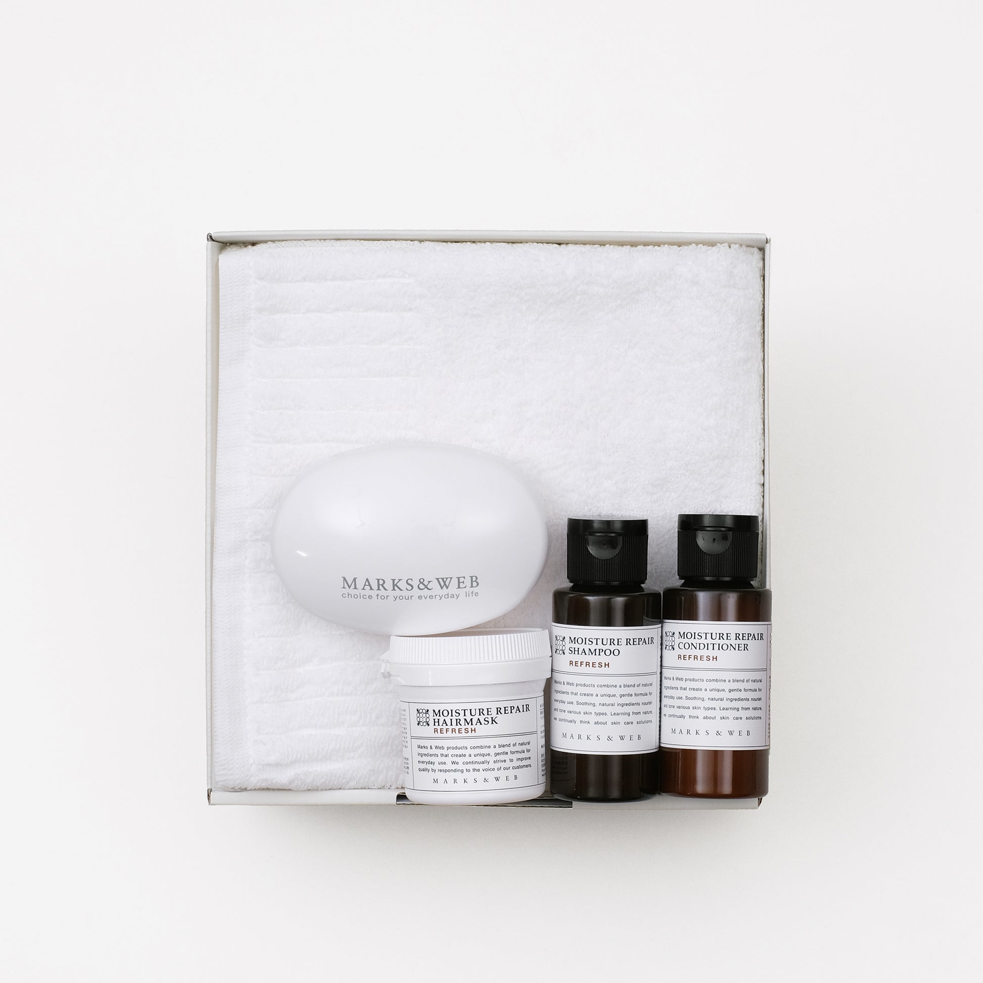 ダメージを補修し、しっとりとまとまりのある髪に整えるシャンプーとコンディショナーに、集中的にケアできるヘアマスクを合わせました。地肌をすっきりと洗い上げるブラシも添えた、念入りなヘアケアができるギフトです。大切な方への贈り物にどうぞ。