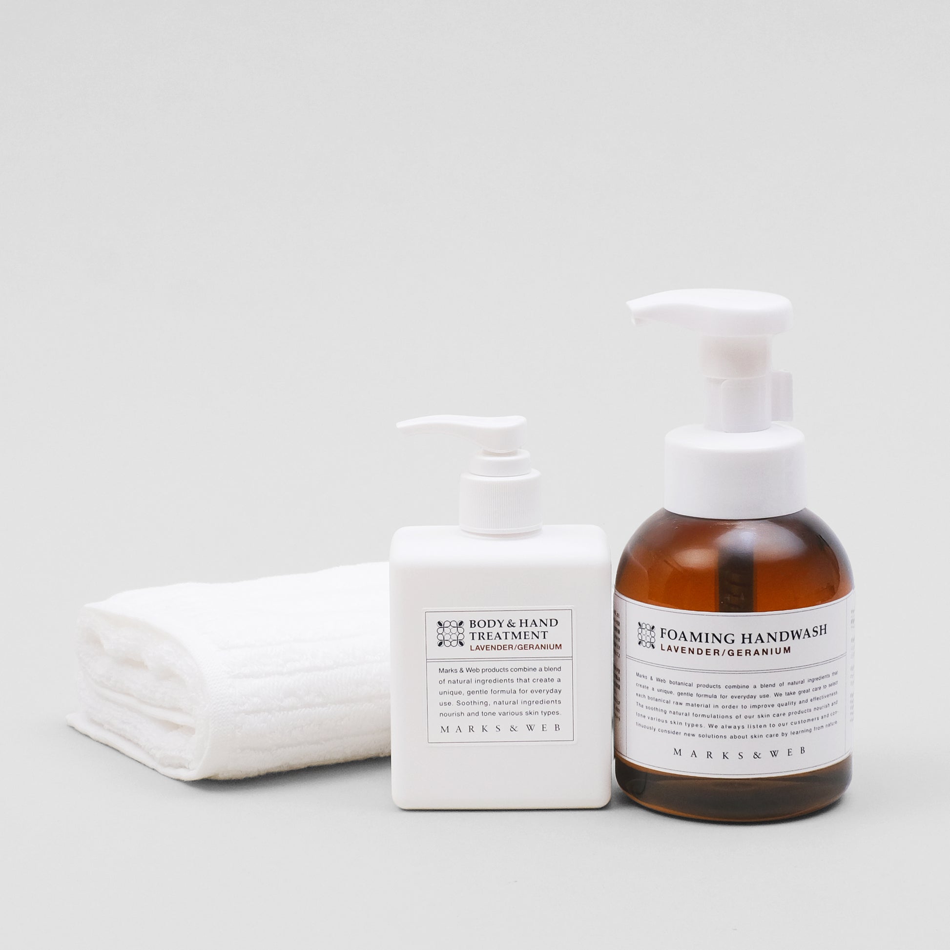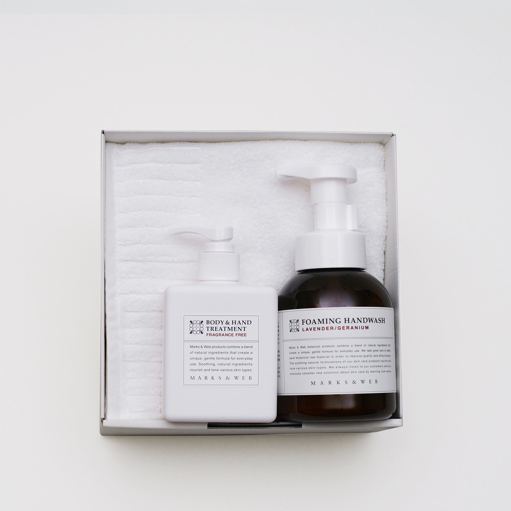 手肌をしっとりとケアできるセットです。泡タイプのハンドソープと高保湿の全身用乳液に、オーガニックコットンのハンドタオルを添えました。お世話になった方へのお礼や、ご家族への贈りものにもおすすめです。