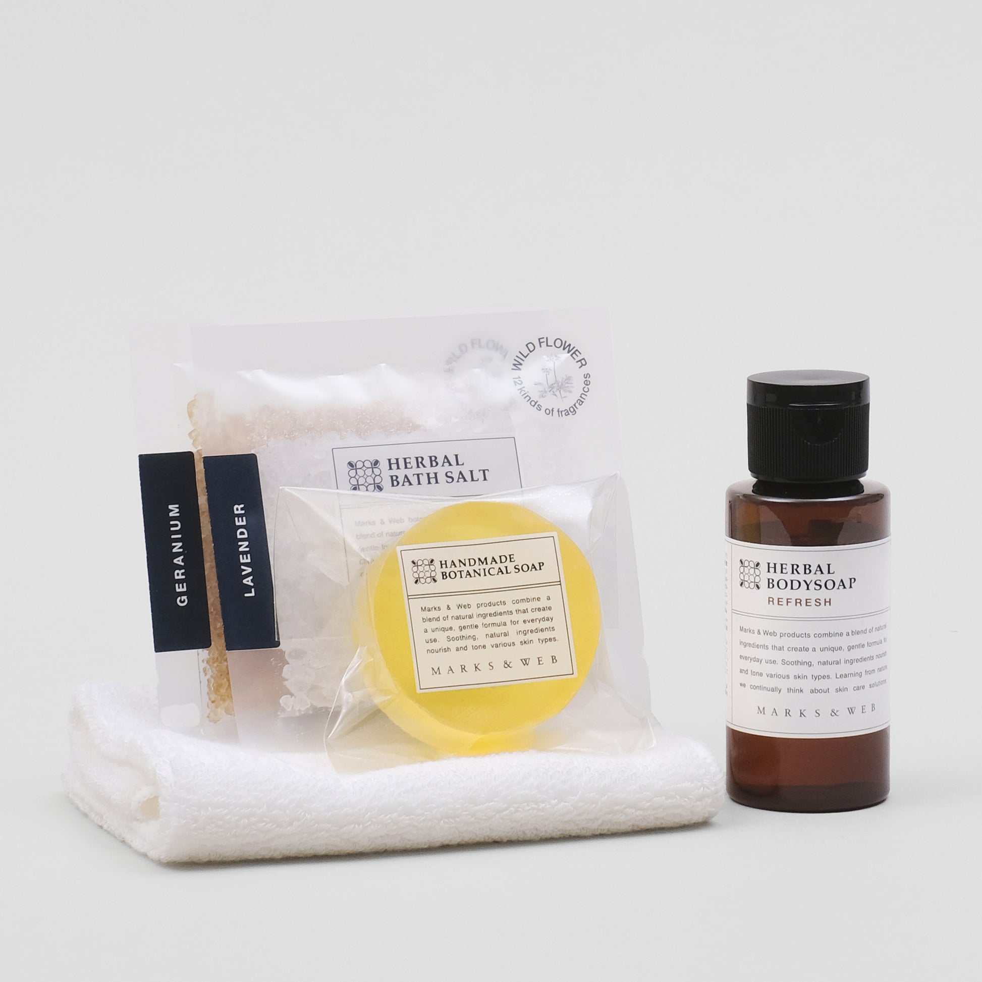 マークスアンドウェブで人気の定番アイテムを組み合わせたバスセットです。石けんとボディソープ、天日塩をベースにしたバスソルトに、ハンカチサイズのコンパクトなタオルを添えました。お試しや旅行に便利なミニサイズの詰め合わせで、香りや使用感を気軽にお楽しみいただけます。