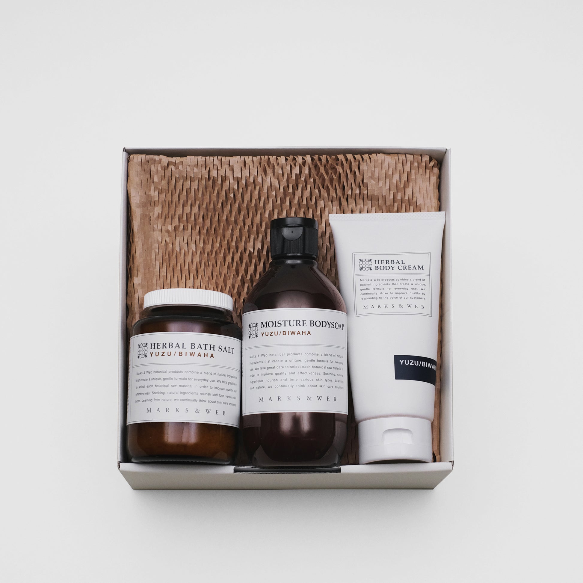 季節限定「ユズ/ビワ葉」の香りを楽しめる、「洗う・潤す」セット。ボディソープとバスソルトは、使うたびにさやわかな香りが浴室に広がります。肌に潤いを与えるボディクリームも添えた、乾燥する季節に使いたいボディケアの贈り物です。ご家族や大切な方へどうぞ。