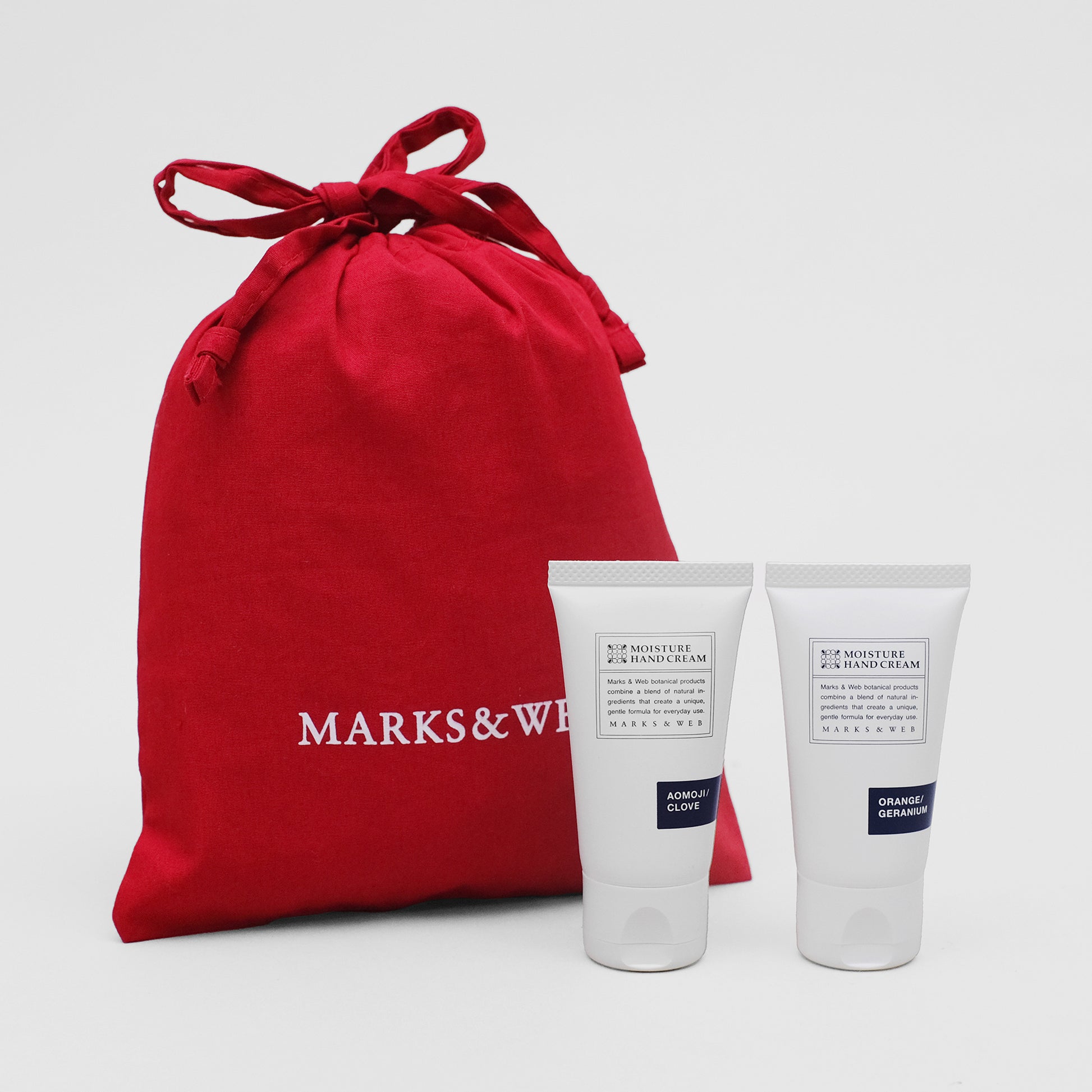 クリスマスをイメージした2種の香りを楽しめるミニサイズのハンドクリームセットを、鮮やかな赤色のポーチに包みました。華やかな「オレンジ/ゼラニウム」と、スパイシーな「アオモジ/クローブ」。そのまま気軽に渡せるギフトです。