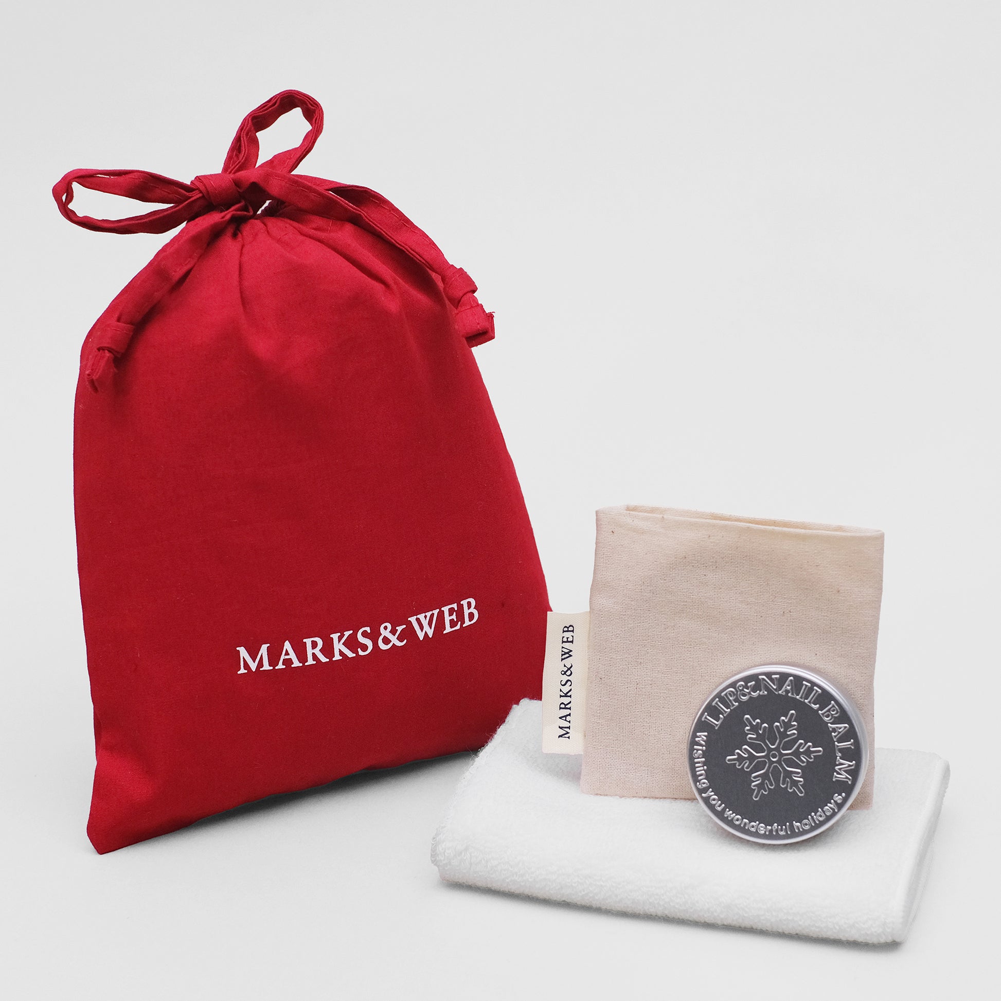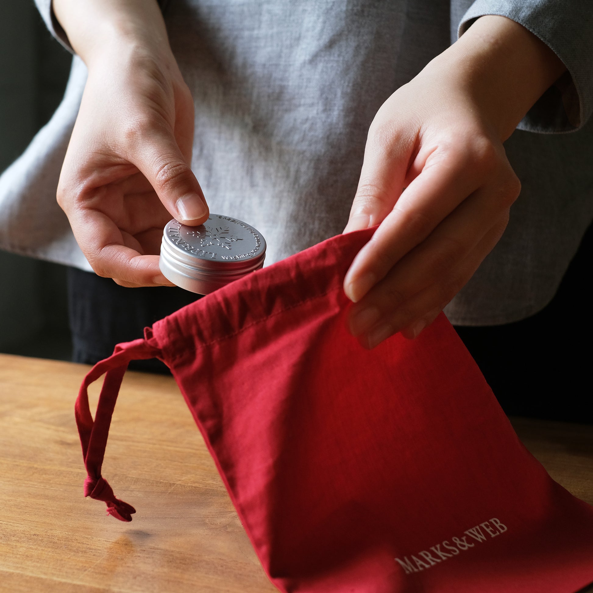 華やかでフルーティーな「オレンジ/ゼラニウム」の缶入り保湿バームと、コンパクトな木製ミラーを赤色のコットンポーチに包みました。外出先でも香りを楽しみながらケアできるプレゼントです。