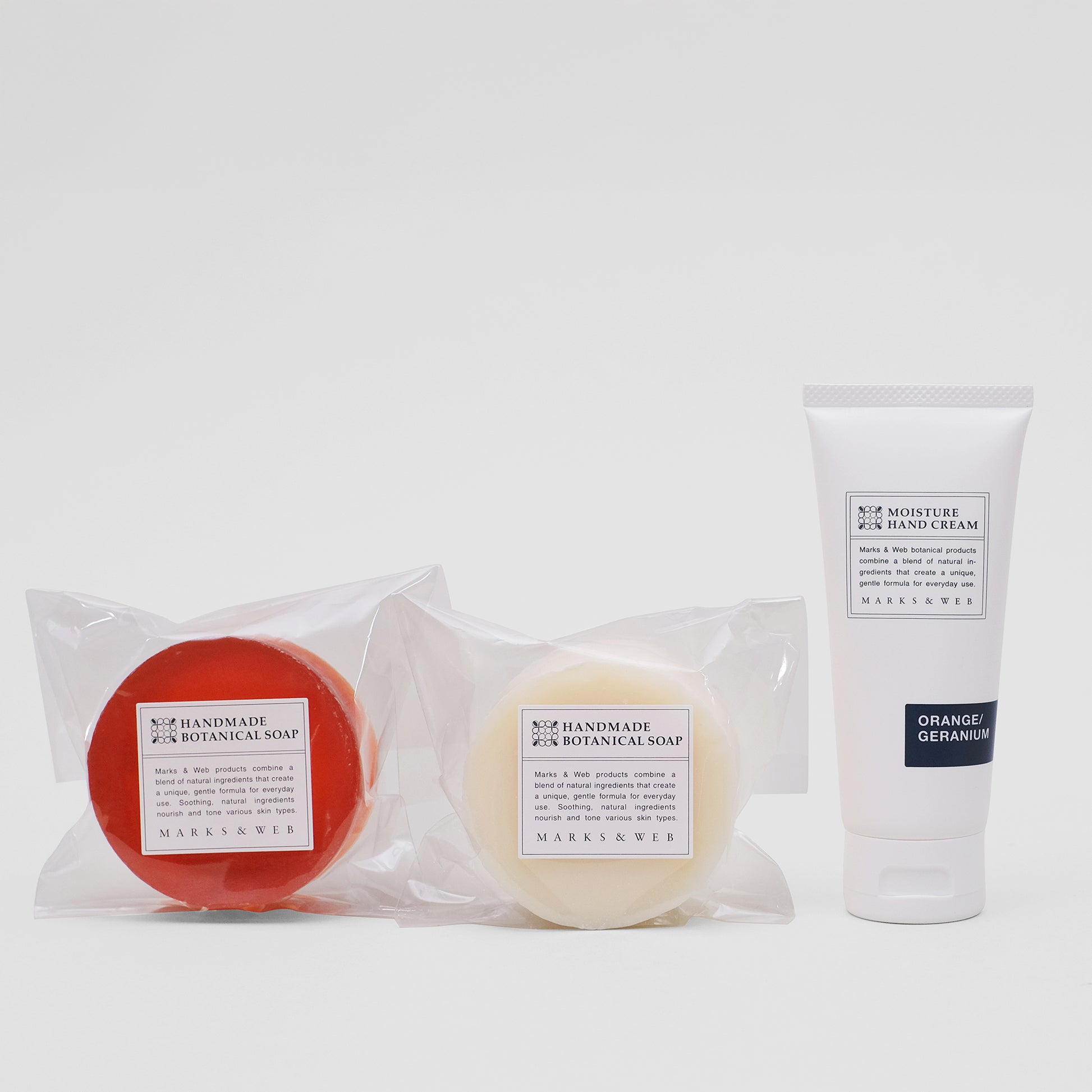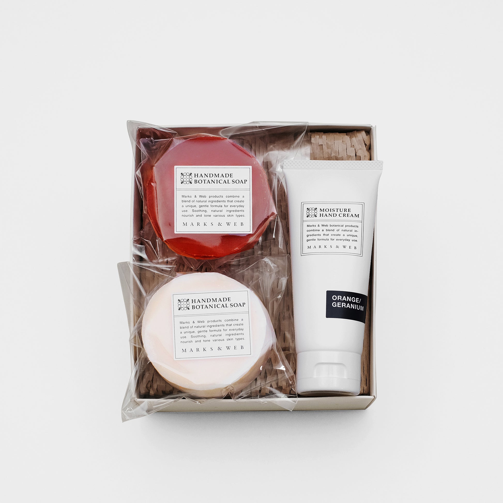 クリスマスに彩りを添える赤と白の限定石けんに、華やかに香る「オレンジ/ゼラニウム」のハンドクリームを組み合わせました。ハンドクリームは、エモリエント成分としてマカデミア種子油やアンズ核油、オリーブ果実油配合の高保湿タイプ。香りを楽しみながら保湿ケアできるセットです。