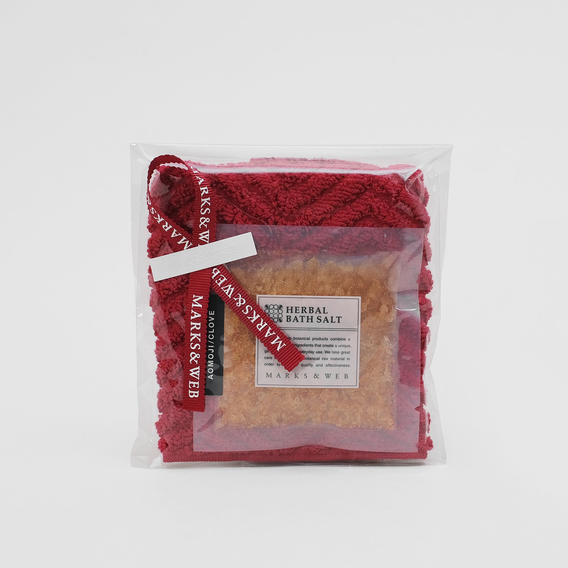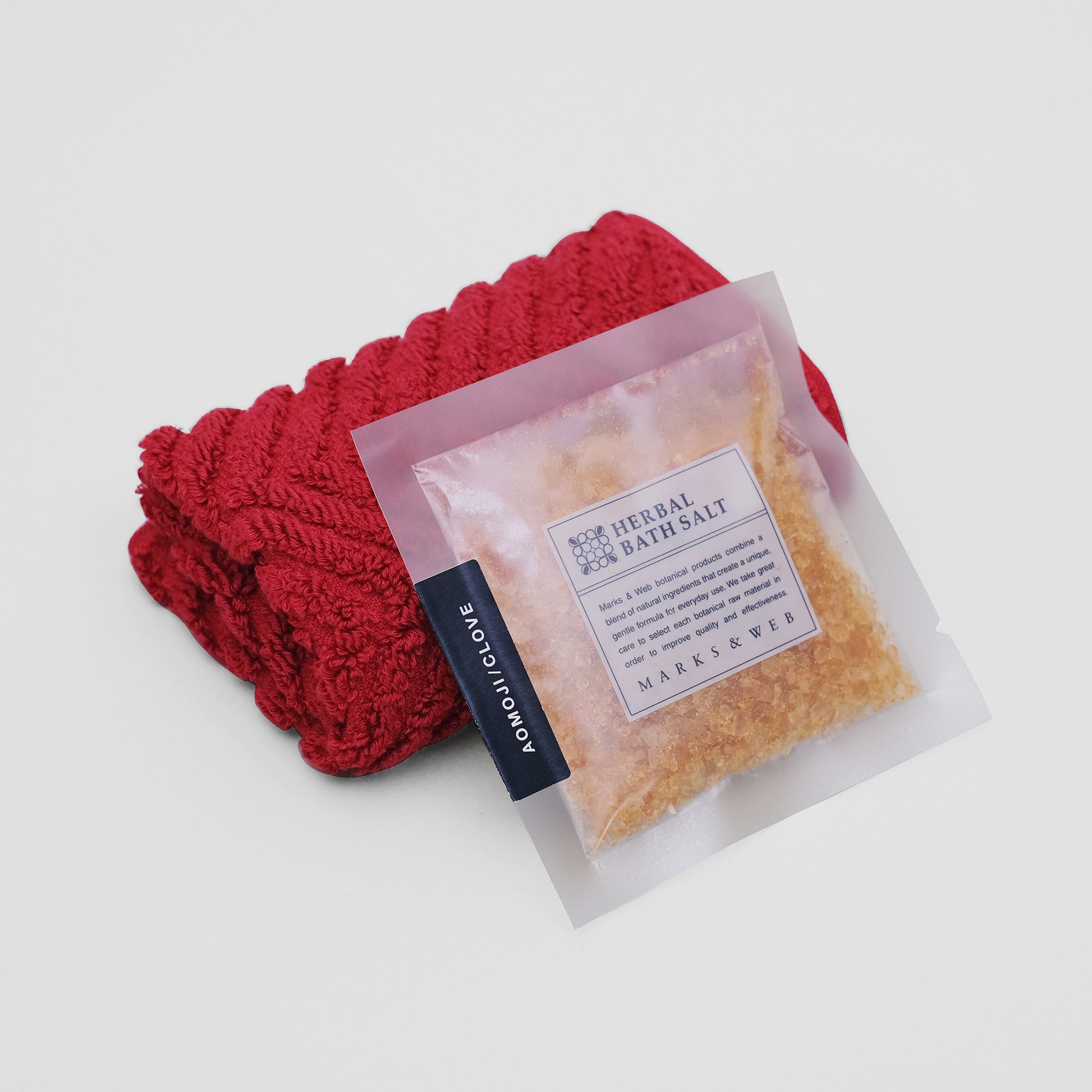 「アオモジ/クローブ」のスパイシーで温もりのある香りのバスソルト1回分に、落ち着きのある上品な赤色のハンカチタオルを添えました。お世話になった方へのお礼やお返しなど、ちょっとしたギフトにどうぞ。