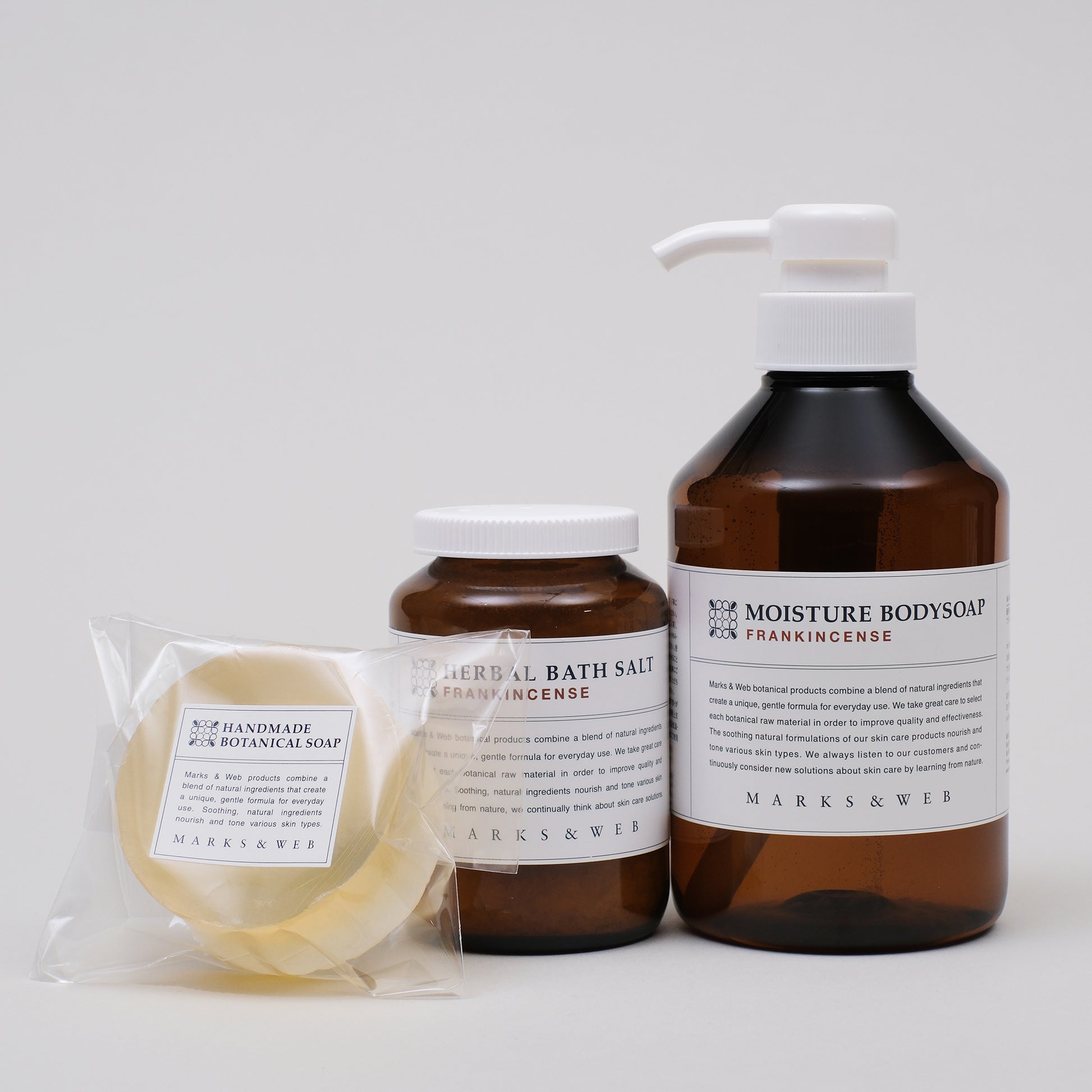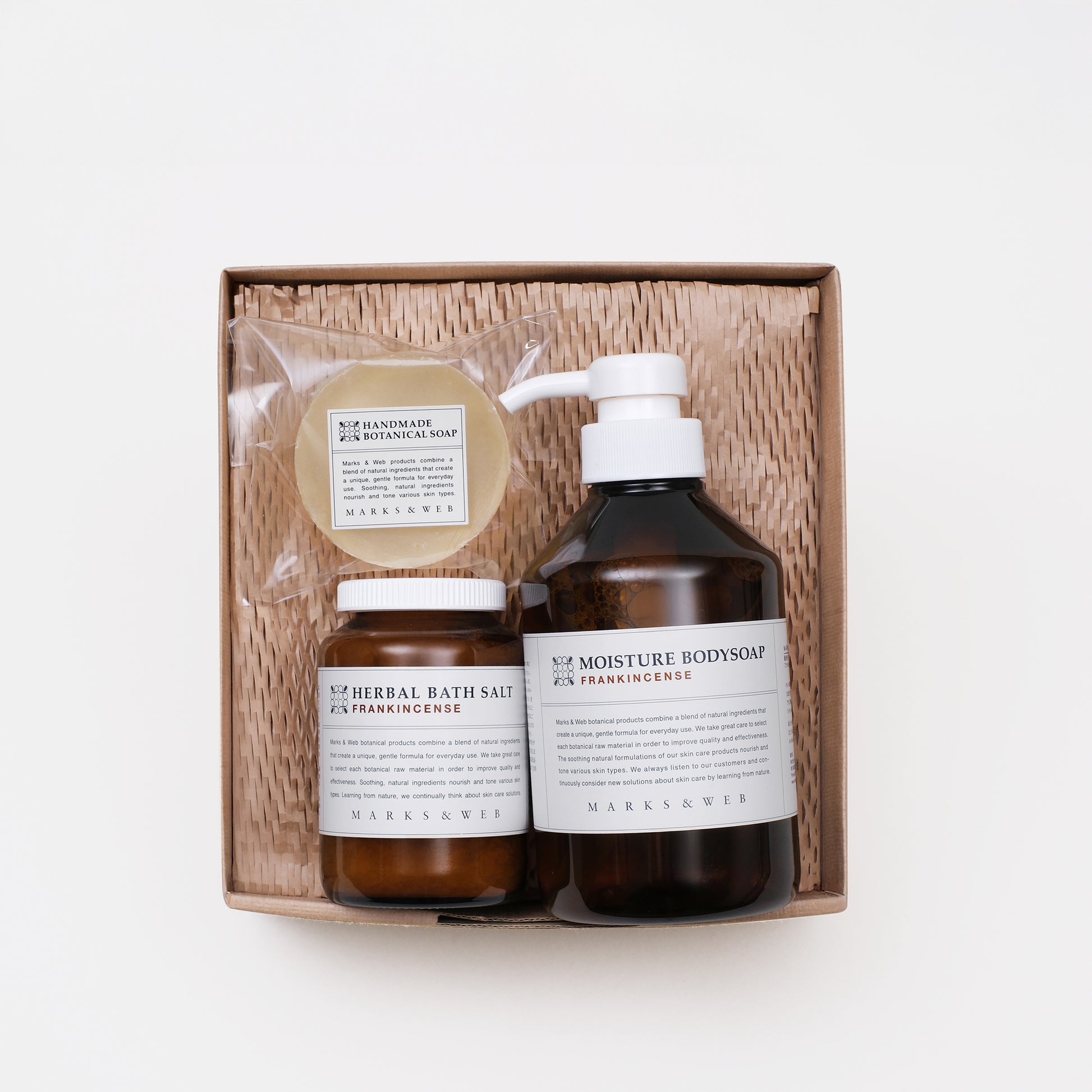 季節限定「フランキンセンス」のバスセット。顔も身体も洗える石けんと、しっとりと洗い上げるボディソープ、天日塩を配合したバスソルトは、使うたびに奥深い樹木の香りが浴室に広がります。一日の終わりにリラックスした時間を過ごしてほしい、という気持ちを込めた贈り物です。