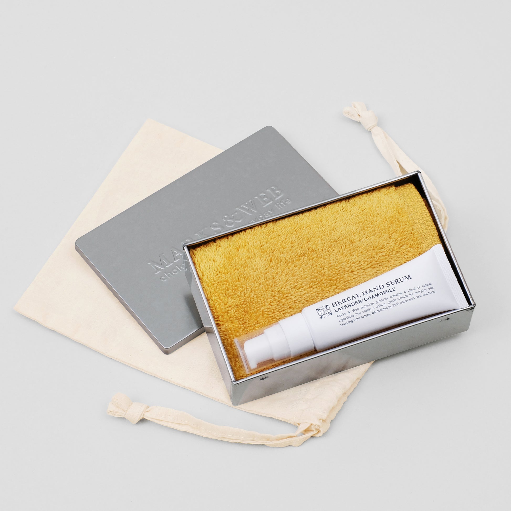数量限定「春のゆらぎ肌を整えるハンドケアセット」をコットンポーチに包みました。オリジナルの缶に、手肌をみずみずしい潤いで包み込む「ハーバルハンドセラム」と、春らしい黄色のタオルの詰め合わせ。日常使いしやすいセットで、ちょっとしたお礼や贈り物にもおすすめです。