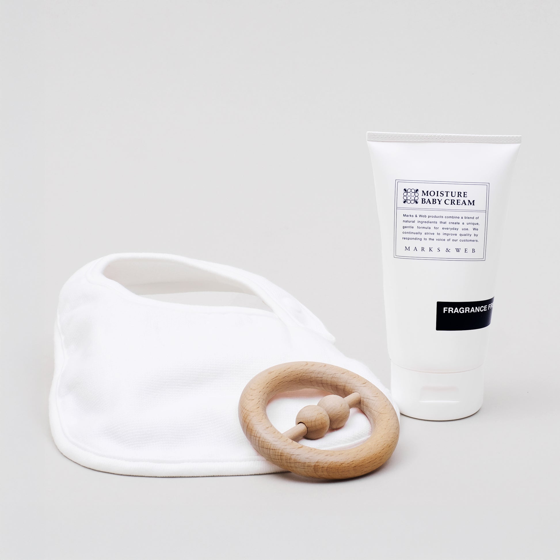 「おめでとう」の気持ちを込めて、オーガニックコットンのやさしい肌触りのビブを贈りませんか。天然木の音が楽しめるラトルと、乳幼児の肌を乾燥から守るクリームを添えたギフトは、ご出産祝いにおすすめです。