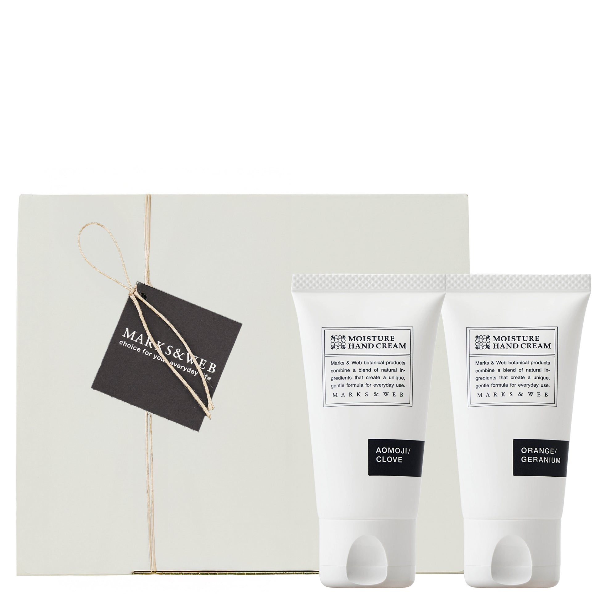 限定のミニサイズのモイスチャーハンドクリーム30gを2本(アオモジ/クローブ・オレンジ/ゼラニウム)を詰め合わせたセットです。エモリエント効果が高く、水分蒸散を防ぐマカデミア種子油・アンズ核油・スクワランに加えて、角質をやわらかくする尿素を配合した高保湿タイプのハンドクリームです。コクのあるしっとりとしたつけ心地で、荒れやすい手肌や繊細な指先に潤いを与えて、乾燥を防ぎます。日頃お世話になっている方への贈り物や、新年のご挨拶としてもおすすめのセットです。スパイシーで温もりを感じる香り「アオモジ/クローブ」と、フルーティーで華やかな香り「オレンジ/ゼラニウム」、2種類の香りをお楽しみいただけます。