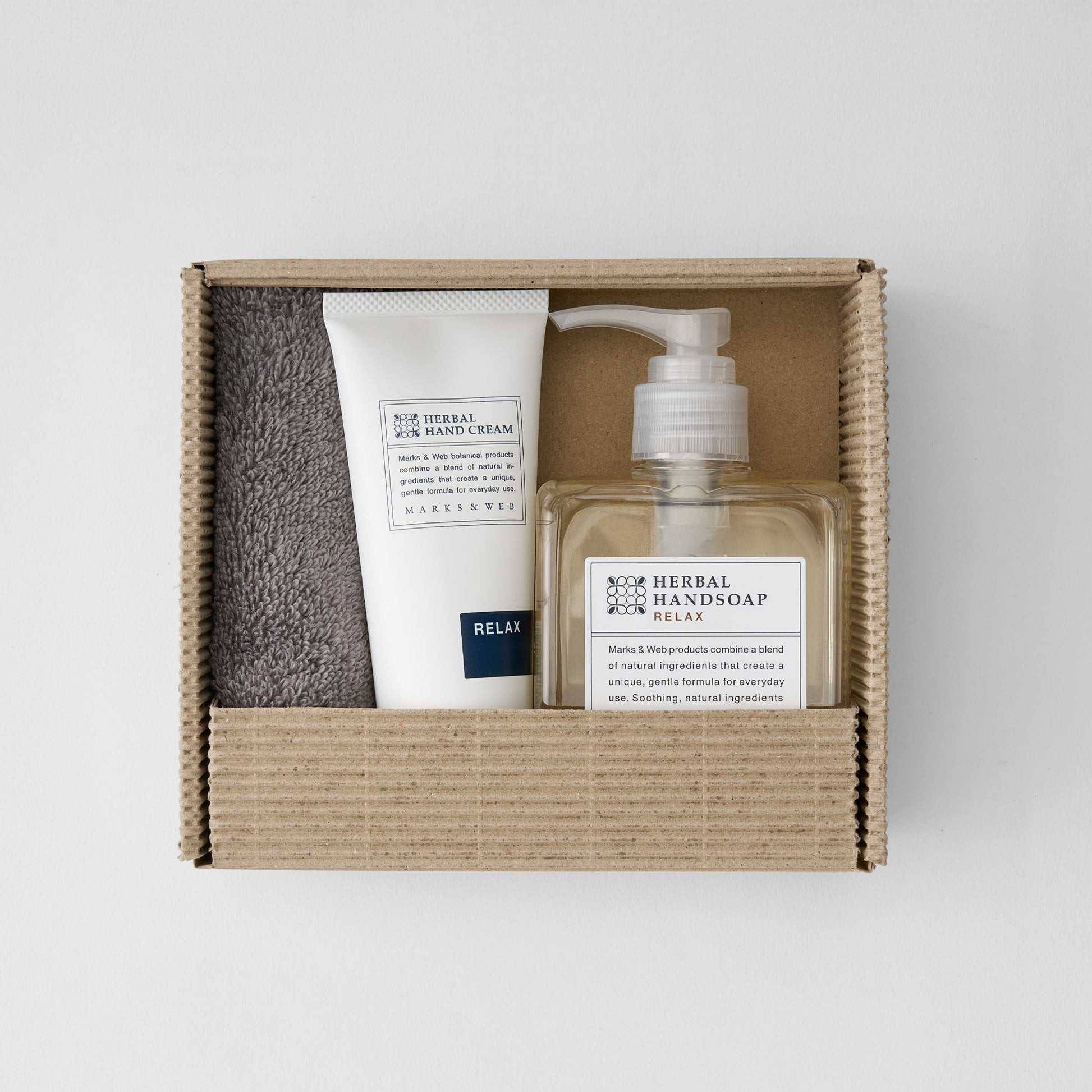 リニューアルした「ハーバルハンドクリーム」と、ギフトにも人気の泡切れのよいハンドソープ、ふわっと軽いやわらかな感触のハンカチタオルを、限定のギフトボックスに詰め合わせました。ハンドクリームとハンドソープは、リラックス・リフレッシュ・ウェイクアップの3種類の香りからお好みに合わせてお選びいただけます。日常使いしやすいセットで、ちょっとしたお礼や贈り物にもおすすめです。