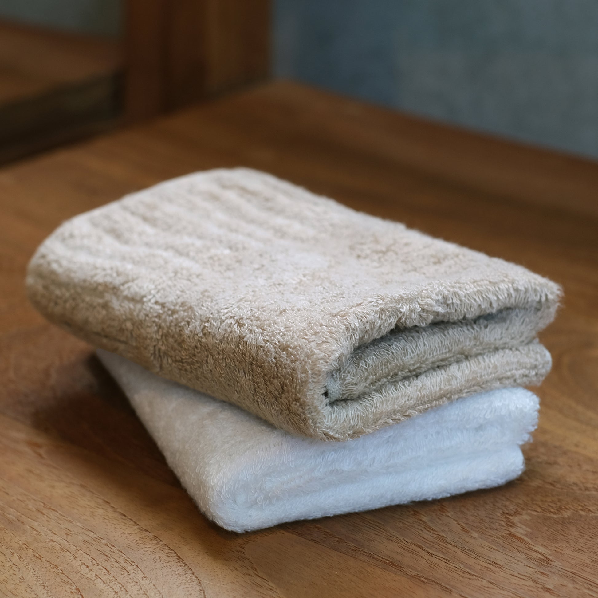 - たっぷりの水で、泳がせるように洗濯してください。粉石けんや天然油脂由来の液体洗剤をご使用いただくと、タオルの風合いをよりよい状態に保つことができます。洗濯後には、日光のあたる風通しのよい場所に広げて干し、乾き切る前に陰干しに移動させるのがおすすめです。タオルの温度を適度に下げることで、素材の含水量を自然な状態に戻すことができ、過乾燥による風合いの劣化を防ぐことができます。干すときには両端を持ってよく振り、空気を含むようにパイルを立たせてから干すと、ふっくらとした風合いが長持ちします。