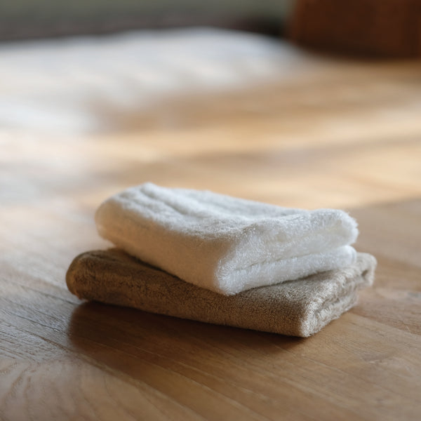 肌に直接触れるパイル部分に、竹を原料としたバンブーレーヨンを使いました。シルクのようななめらかな手触りと、上品な光沢が特長です。吸水性と放湿性にすぐれた繊維のため、パイルのボリュームは控えめに。ベースの生地はオーガニックコットンで高密度に織り上げることで、やわらかくもコシのある、ほどよい厚みのタオルに仕上げました。洗濯後の仕上がりは、思わず顔をうずめたくなるようなやわらかさ。使い勝手のよいハンカチサイズは、外出時にも重宝します。バンブーレーヨンならではの手触りを気に入って、贈り物に選んでいただくことも多いアイテムです。