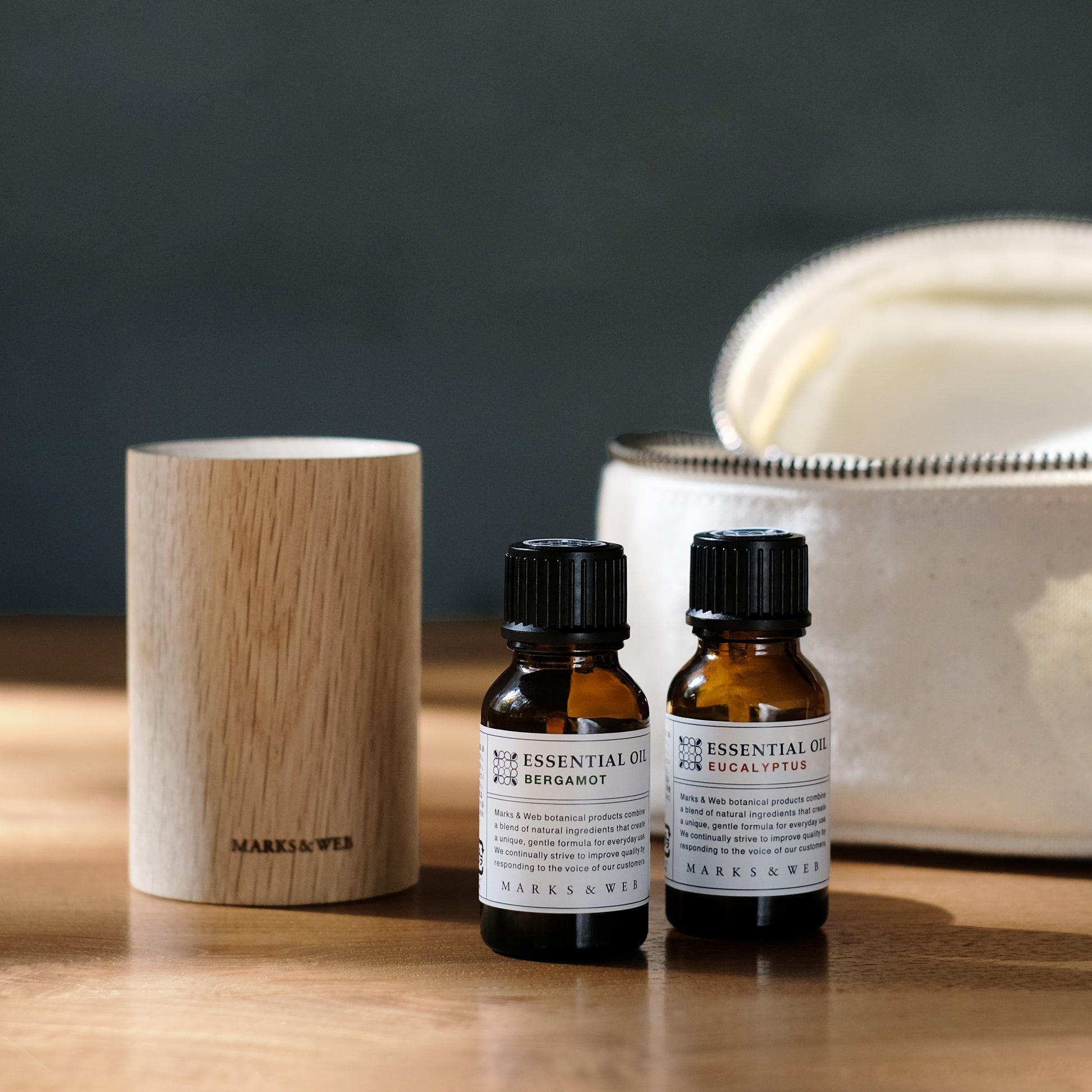エッセンシャルオイルとも呼ばれる天然精油は、植物から抽出される成分。揮発性の芳香物質を含むもので、植物によって芳香物質を合成する部位は異なるため、精油の抽出部位や抽出方法もそれぞれ異なります。マークスアンドウェブで使用している精油は、全草・花・葉・果皮などから、水蒸気蒸留法や圧搾法などによって丹念に抽出したもの。そのまま香りを楽しんだり、希釈して肌につけることもできます。「ブレンドエッセンシャルオイル リラックス」は、ローズを思わせるかぐわしさが印象的なゼラニウム精油と、微かにリンゴのようなフルーティーさが特長のカモミール精油をバランスよくブレンド。フローラルで甘い香りです。