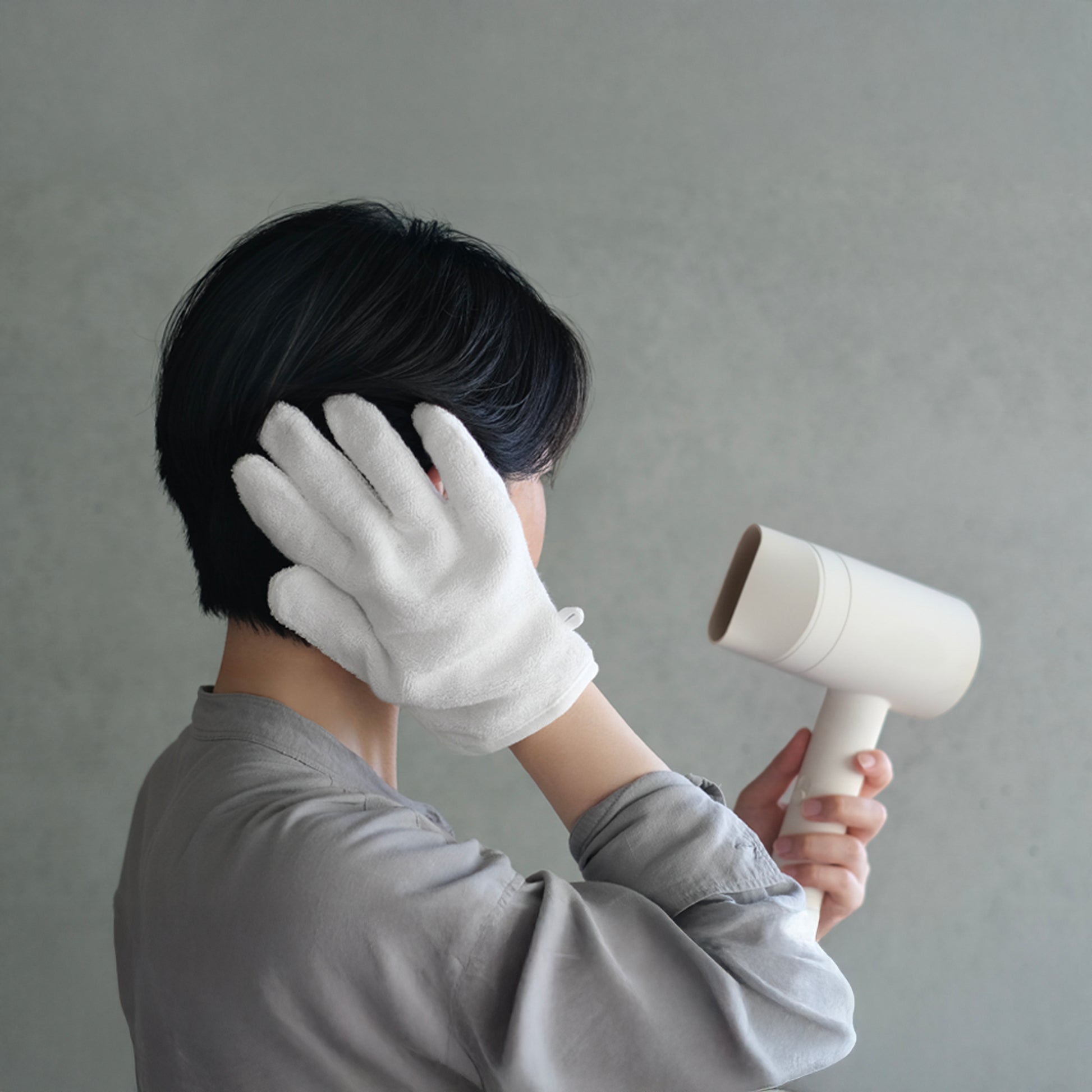 はじめに髪全体の水気を軽く拭き取ります。ドライヤーの風を当てながら、ヘアドライグローブで地肌を揉みこむように、髪の生え際までしっかりと乾かしていきます。バスミトンとして使用する場合は、使う前にお湯に浸して軽く水気を絞り、グローブの中に手を入れて石けんをよく泡立てた後、軽く撫でるように身体を洗ってください。