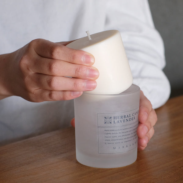 詰め替える際は、中身を使い切った「ハンドメイド リビングキャンドル グラス」または「ハンドメイド ハーバルキャンドル グラス」の容器(グラス)内に溶け残ったワックスを湯せんで溶かし、紙などで拭き取ります。グラス内に残った元の座金部分は外してから、詰替用キャンドルを入れてください。