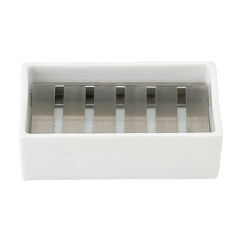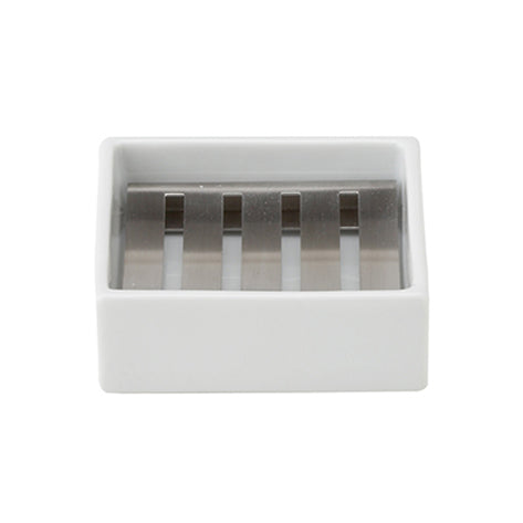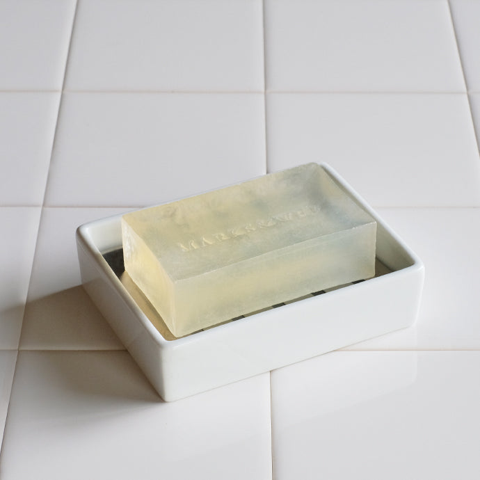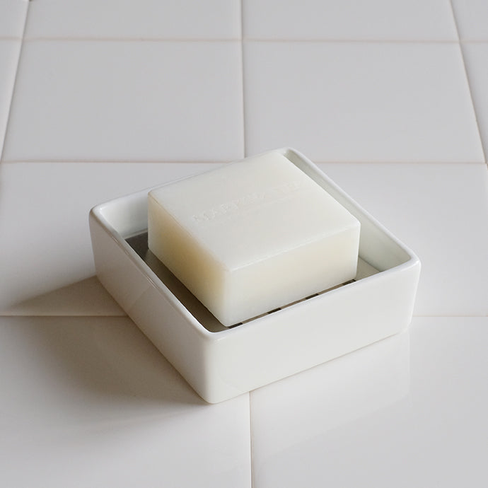清潔感のある白い陶器と、丈夫で水に強いステンレスの水切りを組み合わせたソープディッシュです。お手入れしやすいよう、水切りは取り外しができるようにしました。こまめに受け皿の水を捨て、水切りを洗っていただくことで、さびの発生を防ぎ長くご使用いただけます。正方形のSサイズは「ハンドメイドボタニカルソープ」の100gがぴったりと収まるサイズ。複数の石けんを使う場合や、長方形の石けんにはLサイズがおすすめです。石けんの大きさに合わせてお選びください。